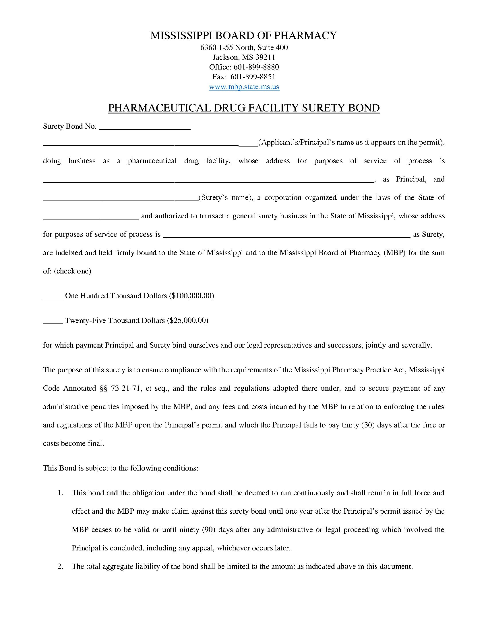 The Mississippi Pharmaceutical Drug Facility Bond starts at $250 plus shipping costs and fees. Fill out the form to buy your bond instantly!