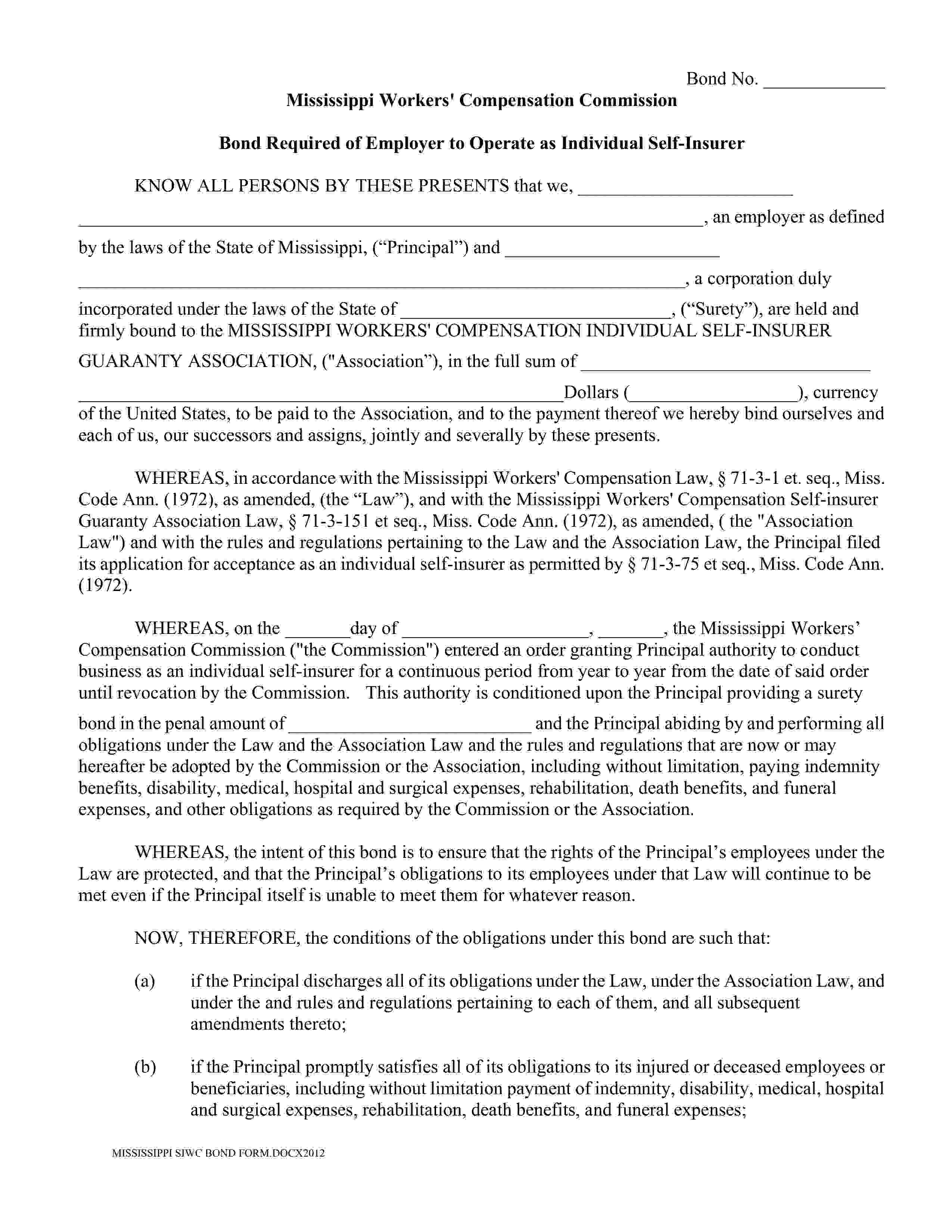 Mississippi Workers' Compensation Commission Self-Insurer of Workers Compensation Bond