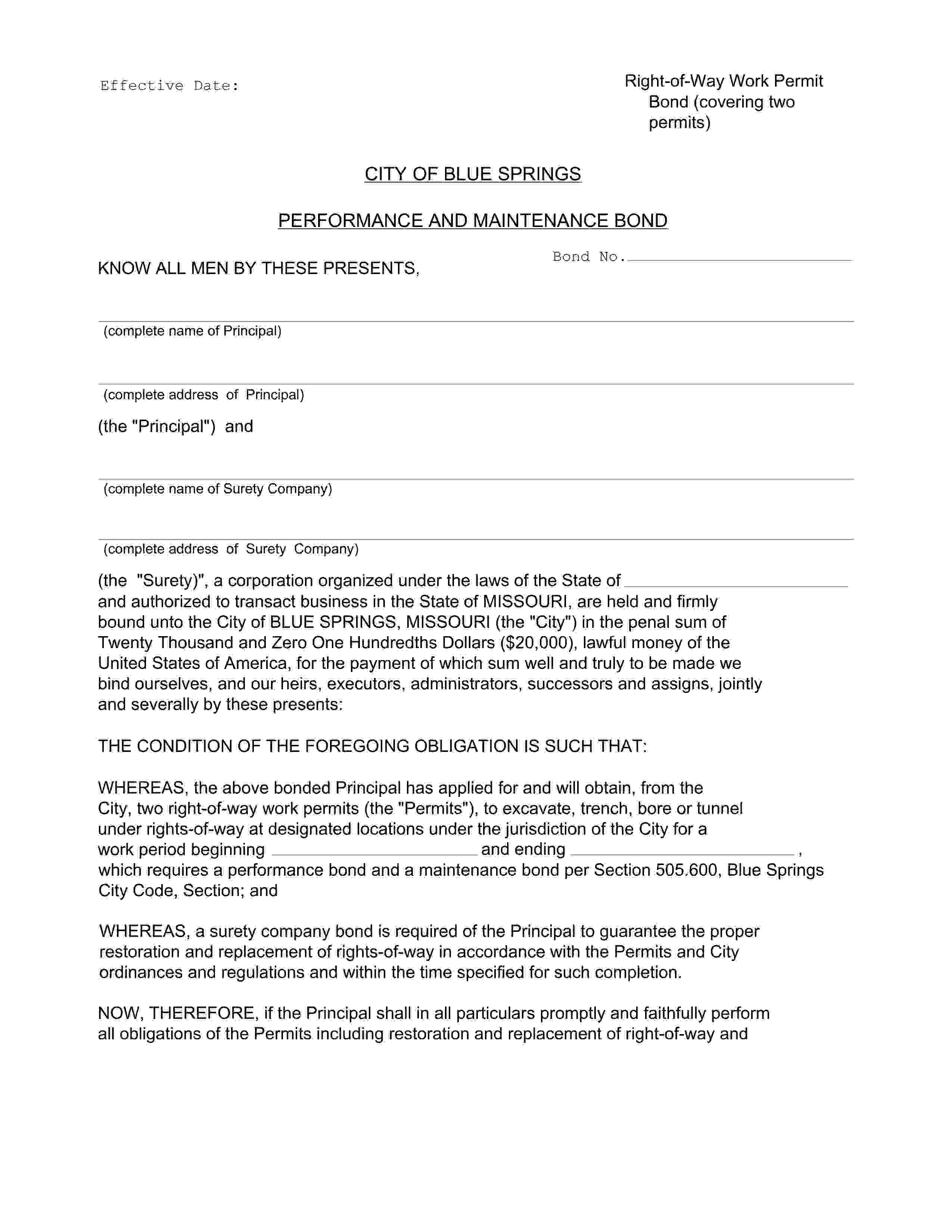 The Missouri City of Blue Springs Right-of-Way Work Permit Bond starts at $200 plus shipping costs and fees. Fill out the form to buy your bond instantly!
