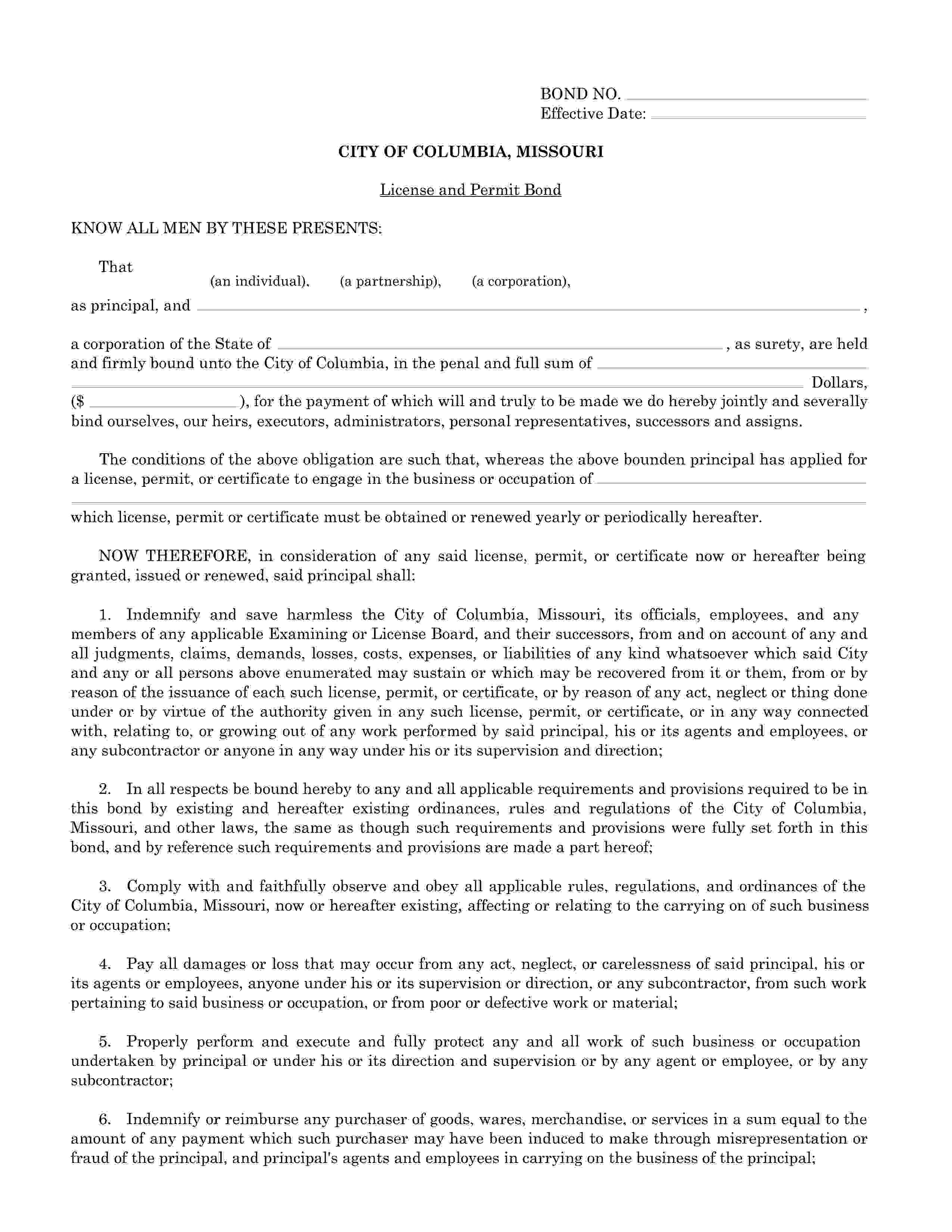 The Missouri City of Columbia Columbia - City License and Permit Bond starts at $100 plus shipping costs and fees. Fill out the form to buy your bond instantly!