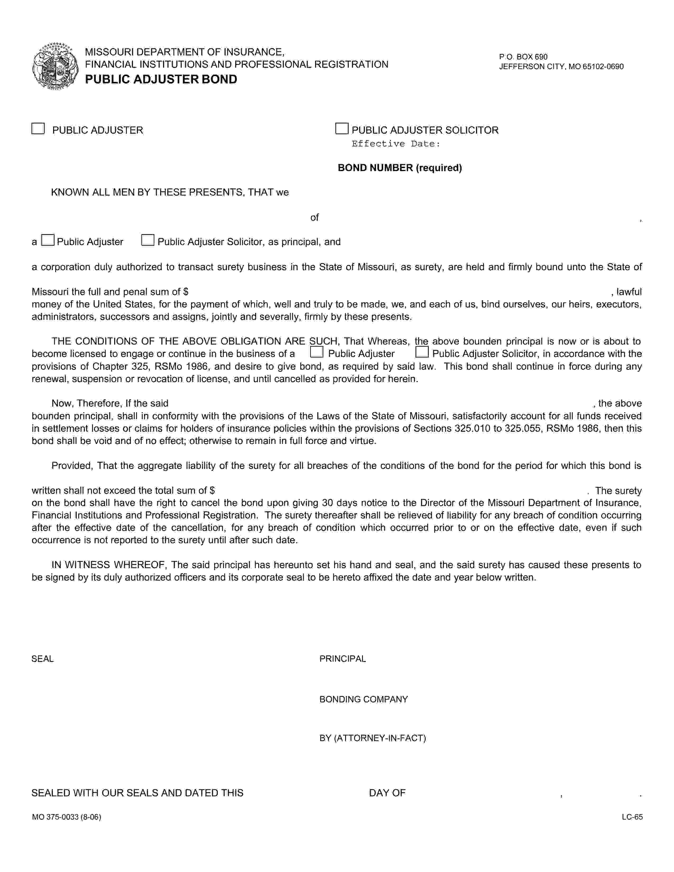 State of Missouri Public Adjuster or Public Adjuster Solicitor Bond