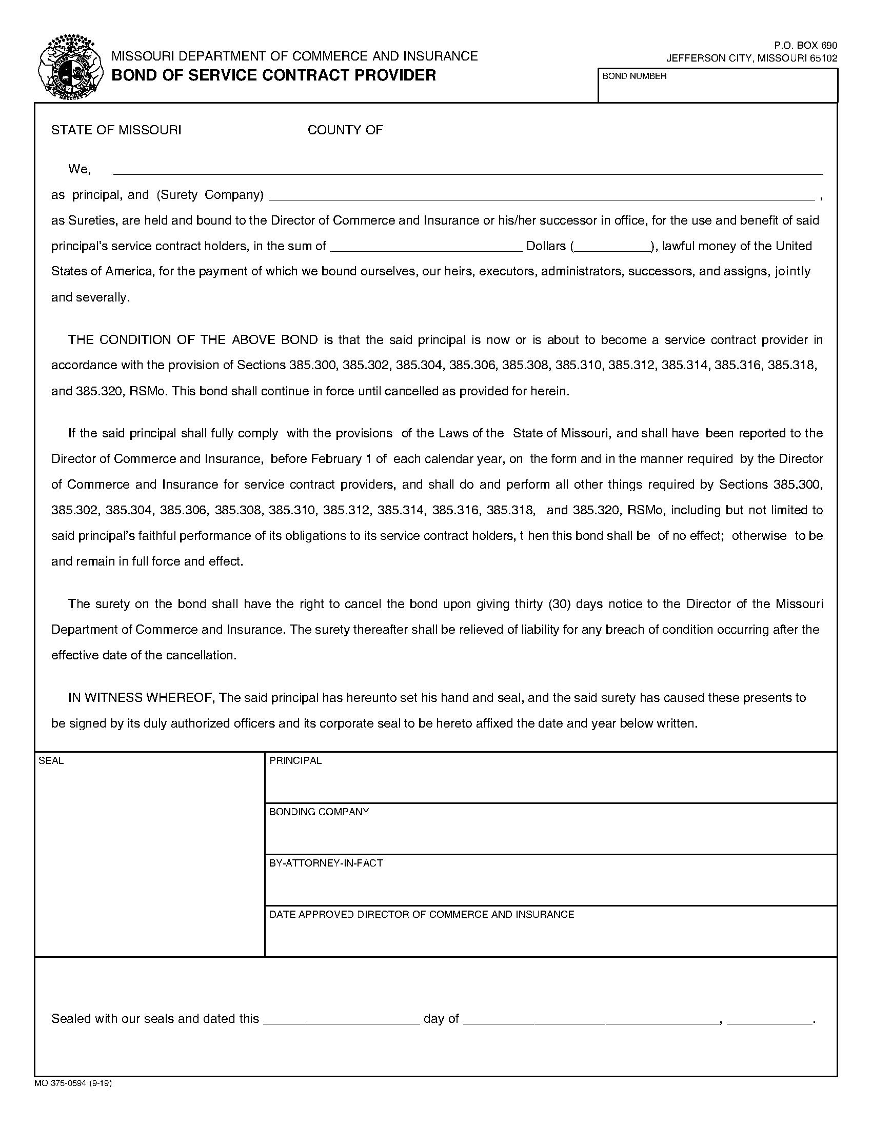 Missouri Department of Insurance Service Contractor Provider Bond