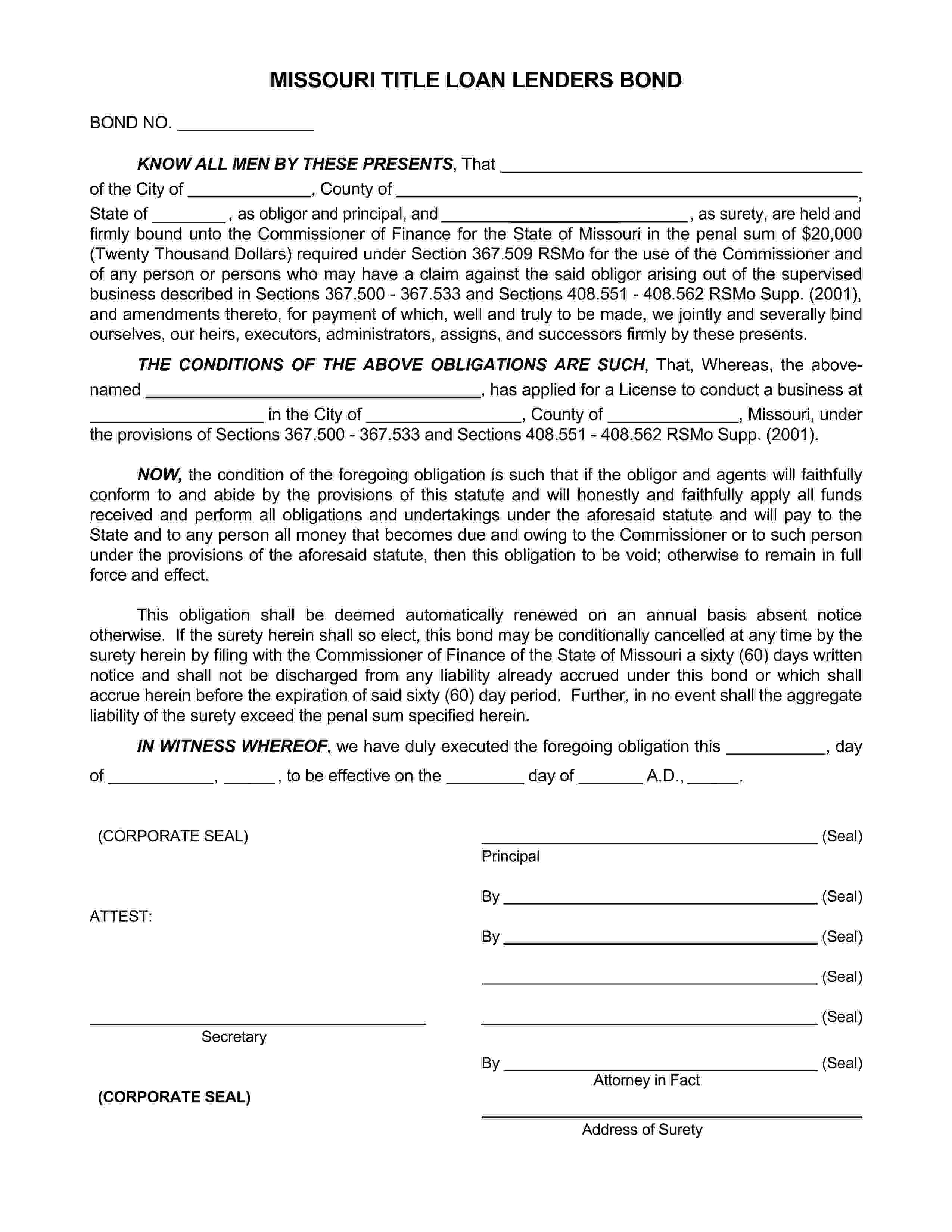 The Missouri Title Loan Lender Bond starts at $200 plus shipping costs and fees. Fill out the form to buy your bond instantly!