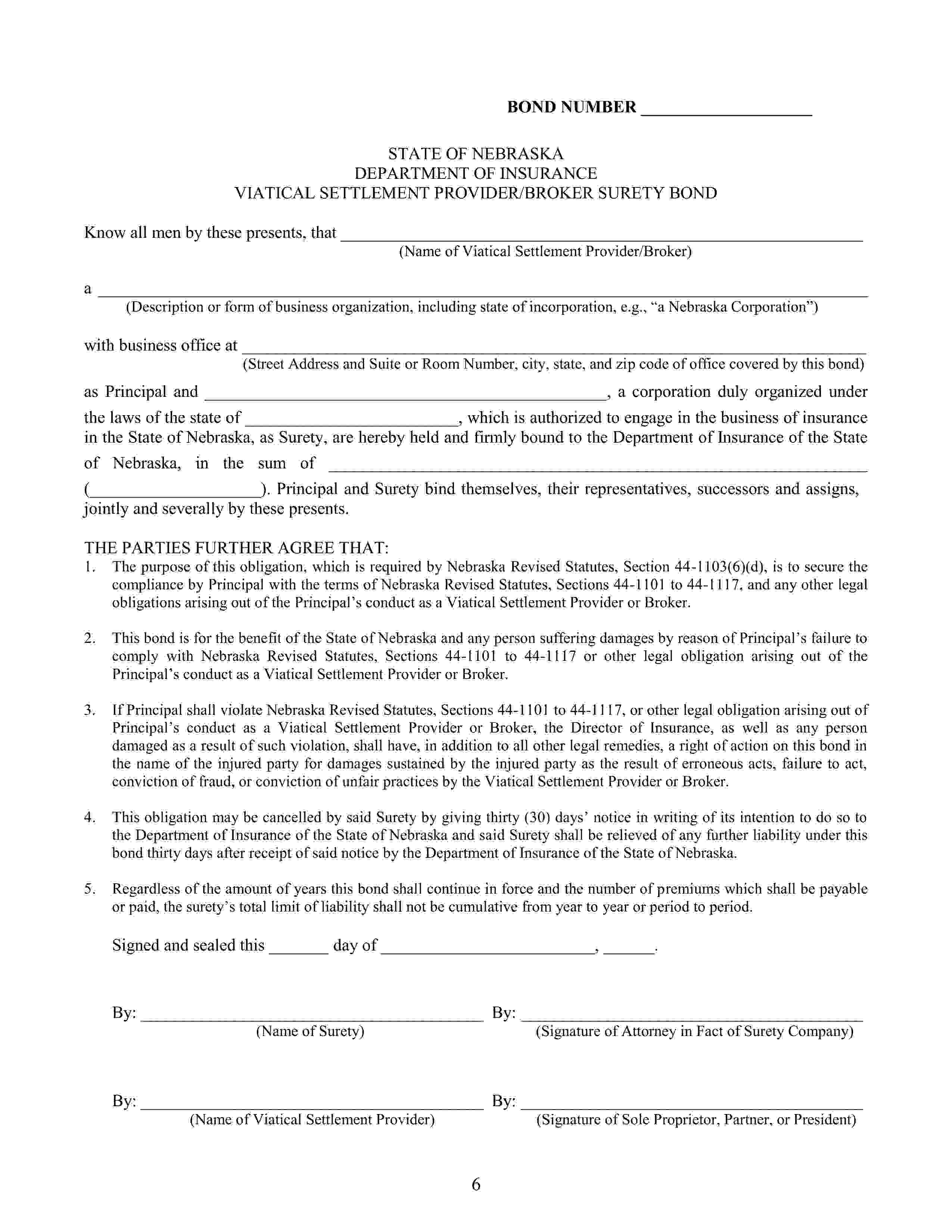 State of Nebraska Viatical Settlement Provider/Broker Bond