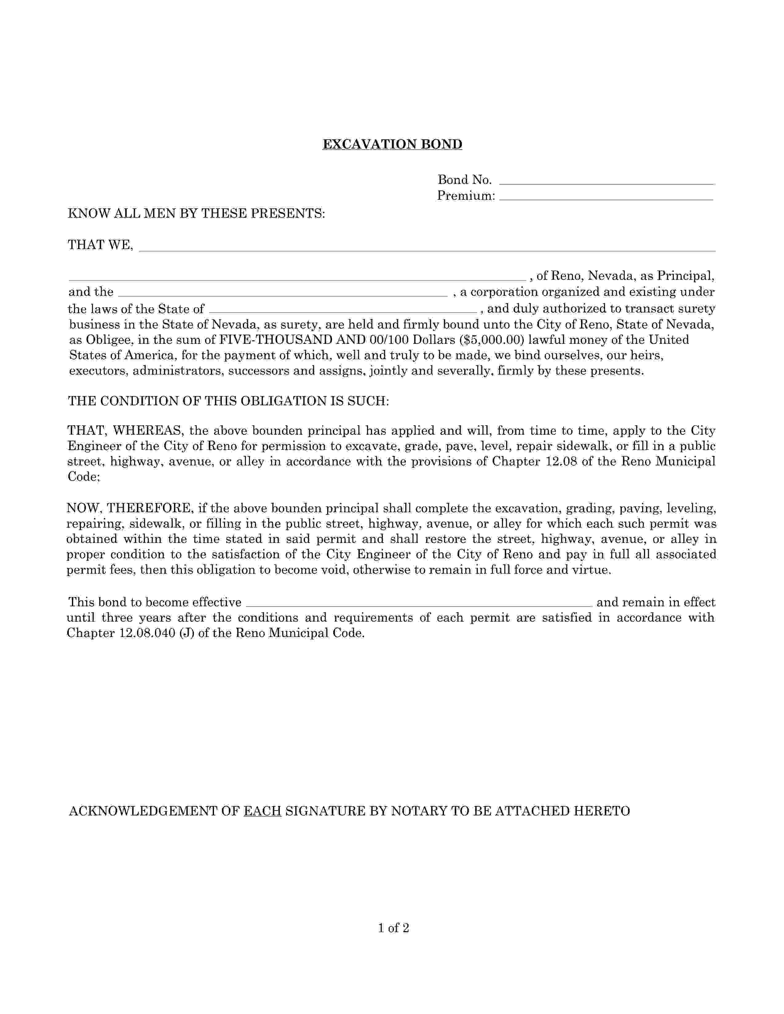 City of Reno Excavation Bond
