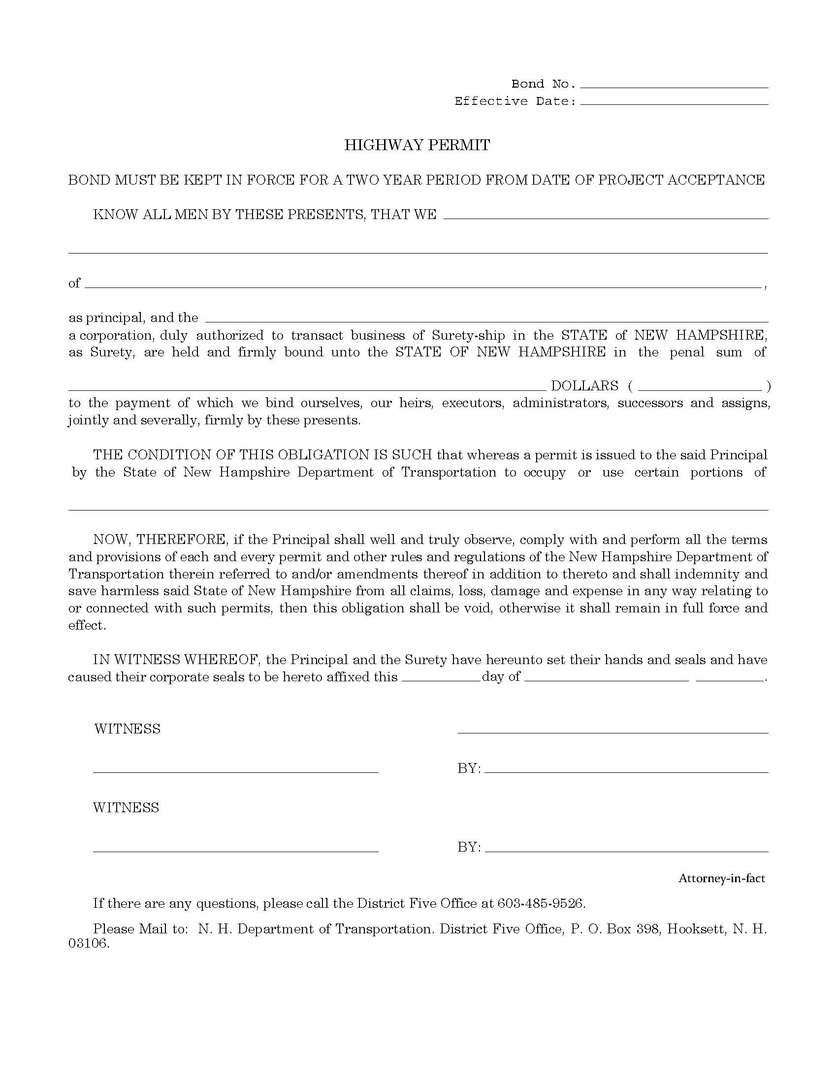 The New Hampshire Highway Permit Bond starts at $100 plus shipping costs and fees. Fill out the form to buy your bond instantly!