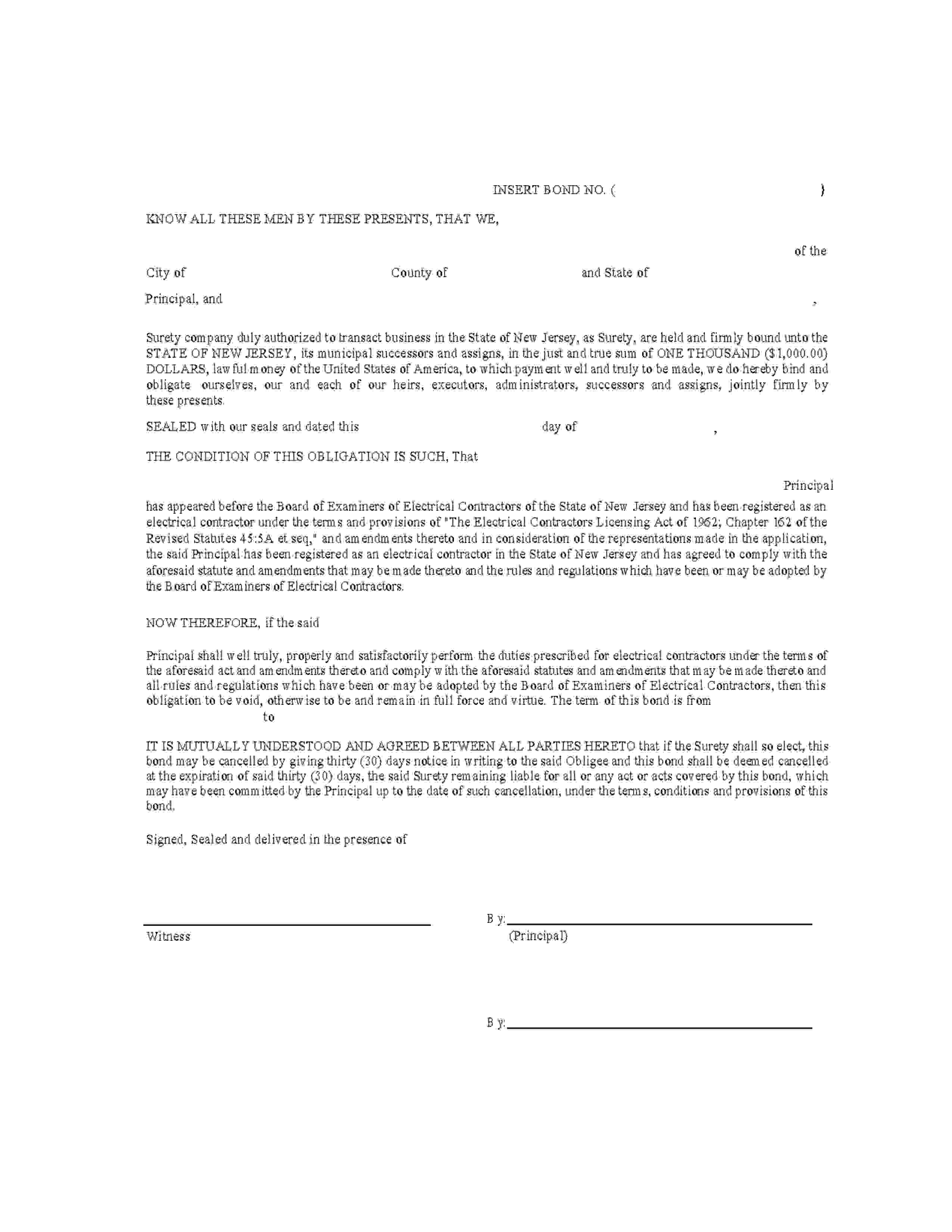 State of New Jersey Electrical Contractor Bond
