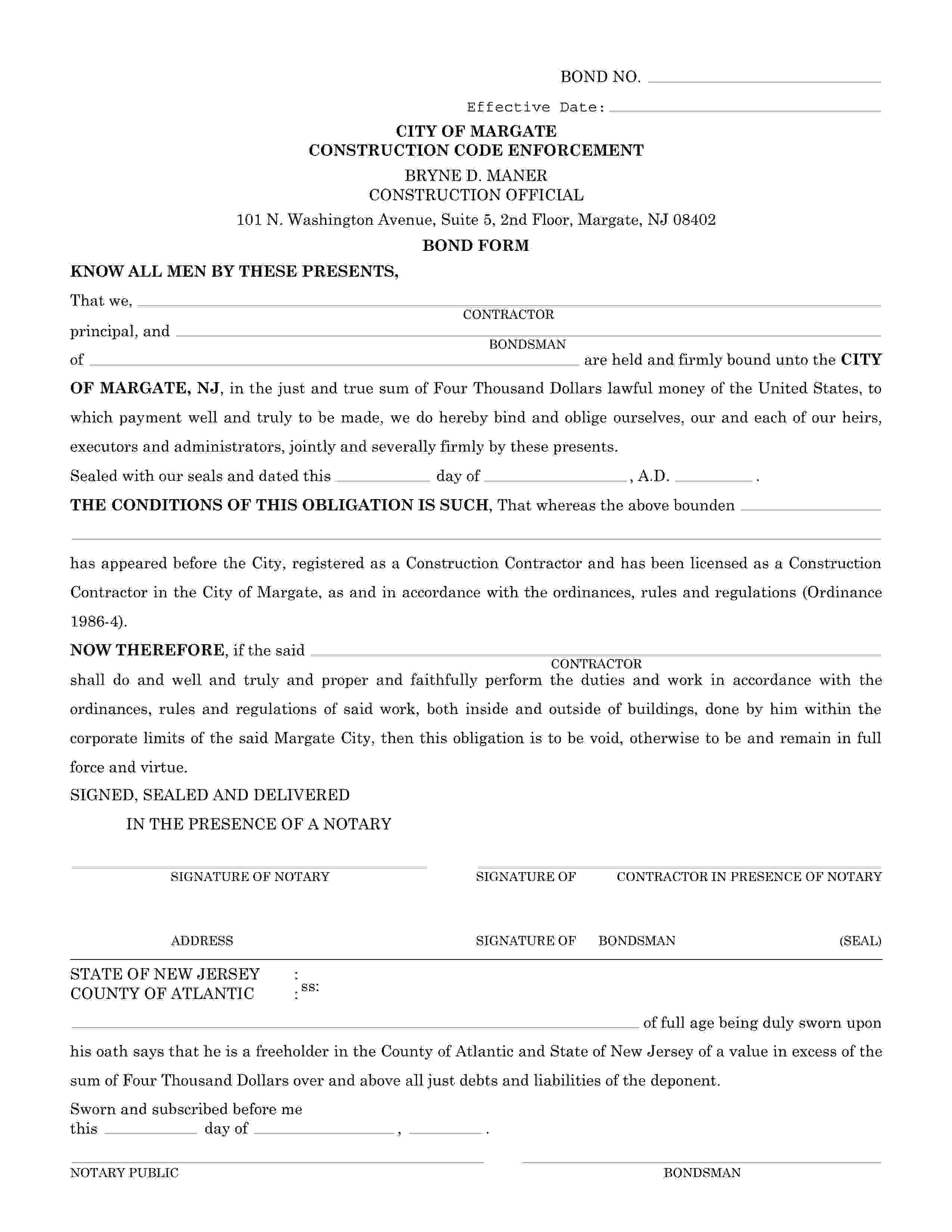 The New Jersey Margate - City Construction Contractor Bond starts at $100 plus shipping costs and fees. Fill out the form to buy your bond instantly!