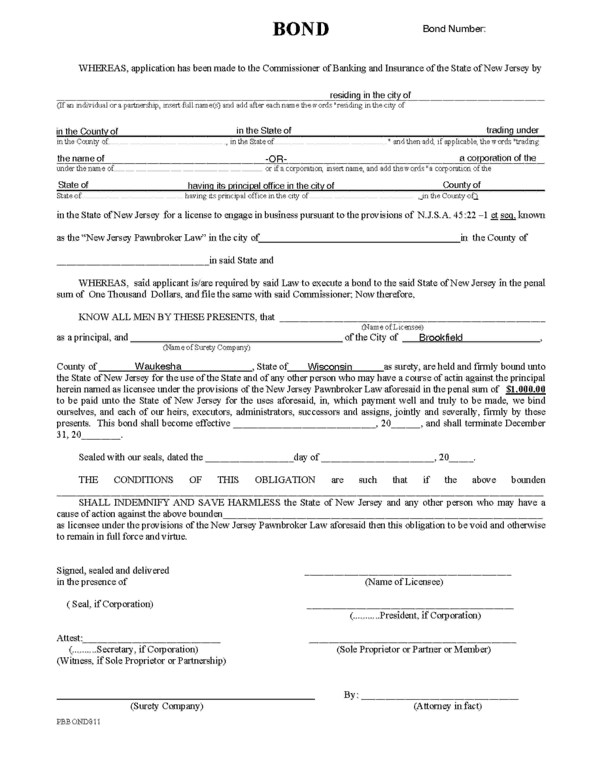 The New Jersey Pawnbroker Bond starts at $100 plus shipping costs and fees. Fill out the form to buy your bond instantly!