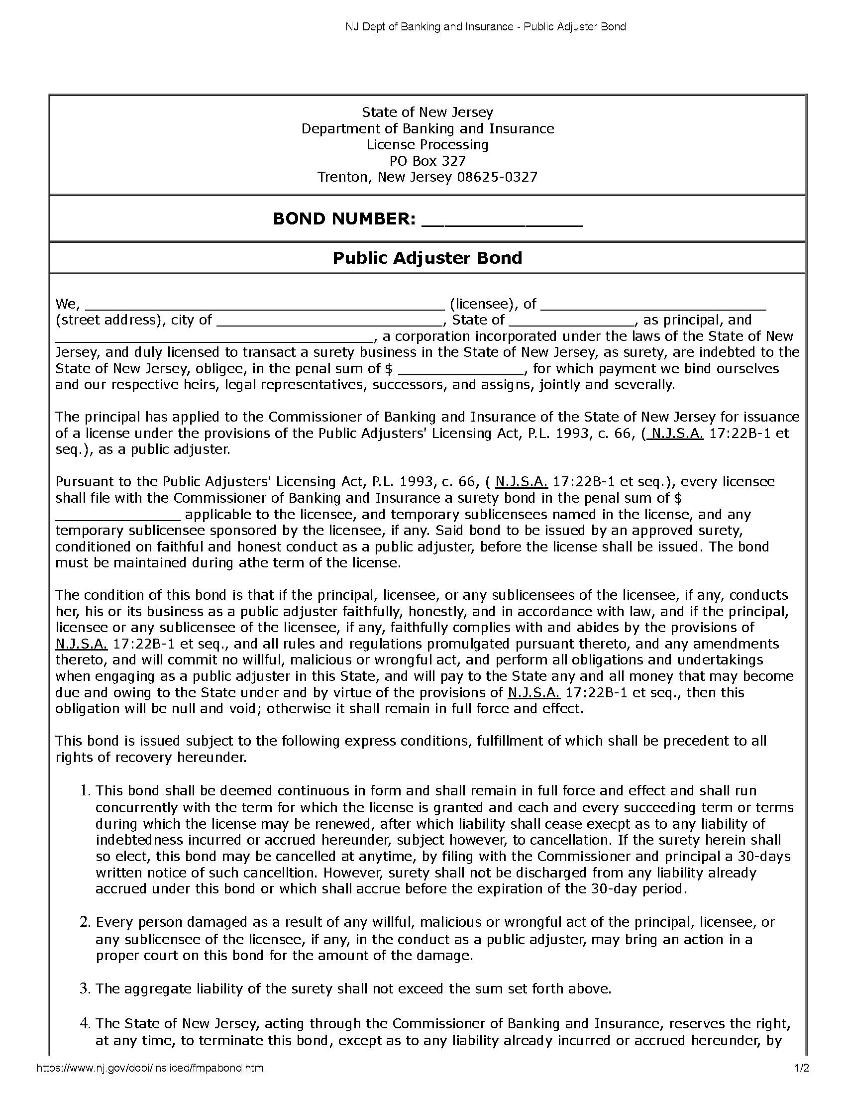 State of New Jersey, Department of Banking and Insurance Public Adjuster Bond