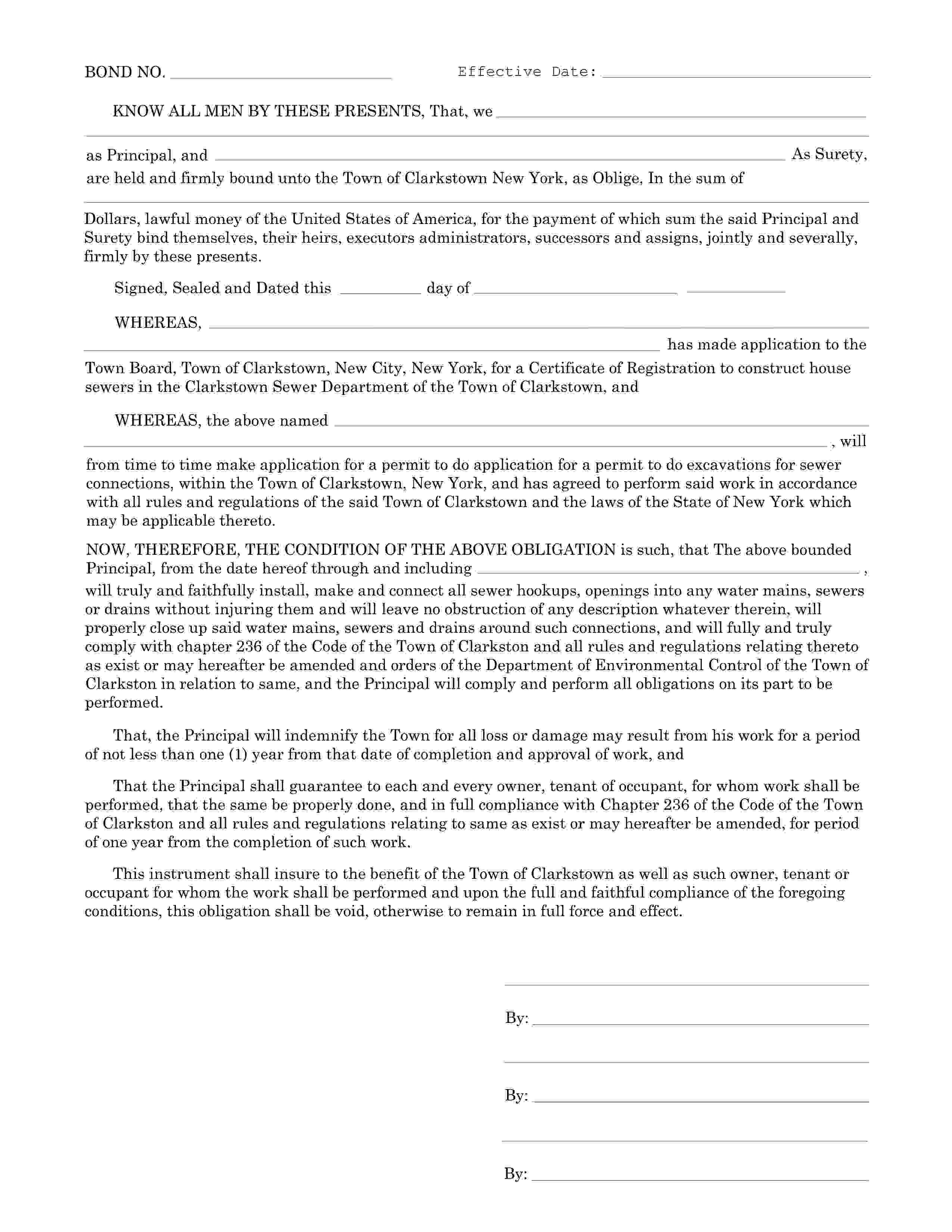 The New York Town of Clarkstown Excavations for Sewer Connections Bond starts at $100 plus shipping costs and fees. Fill out the form to buy your bond instantly!