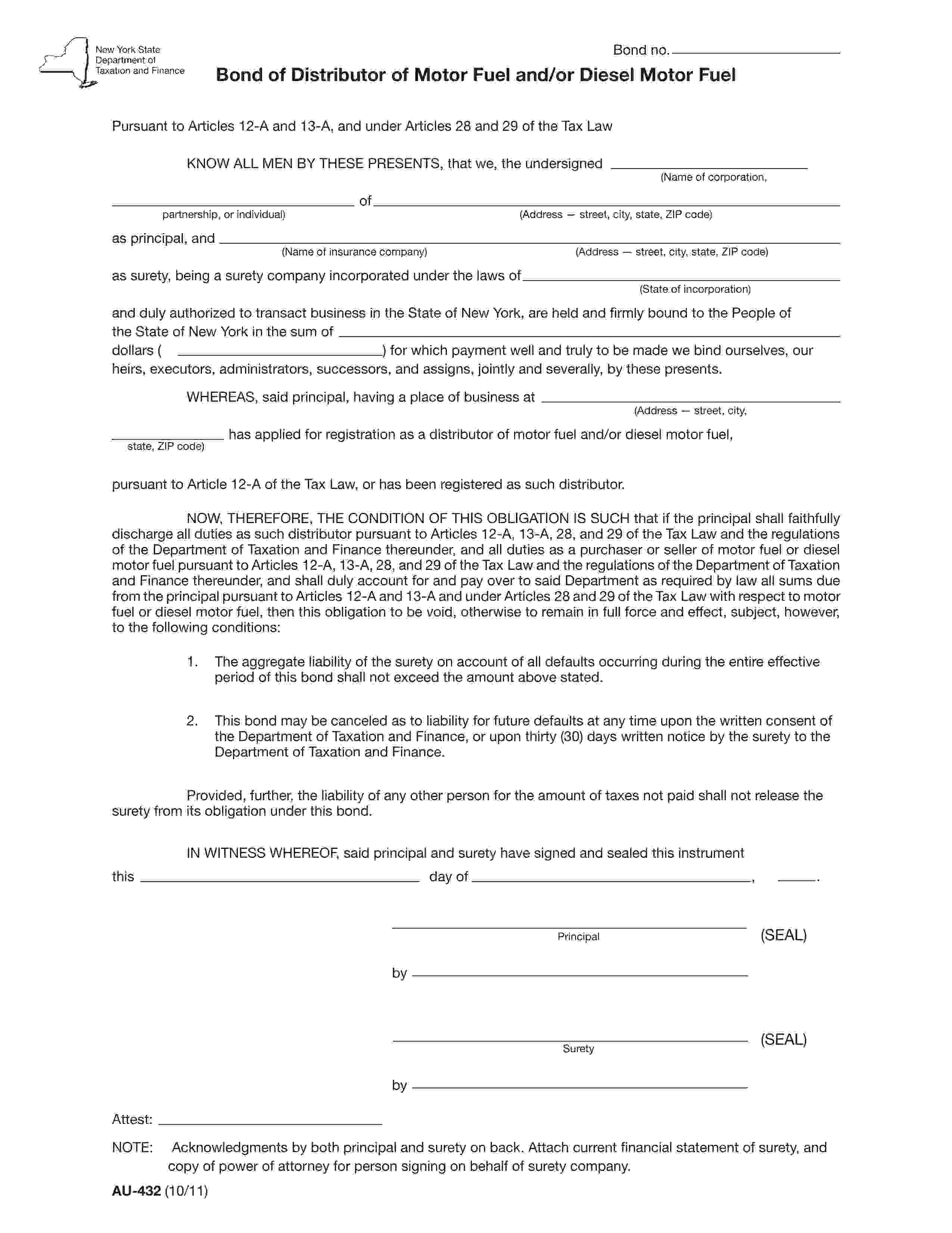 State of New York Distributor of Motor Fuel and/or Diesel Motor Fuel Bond
