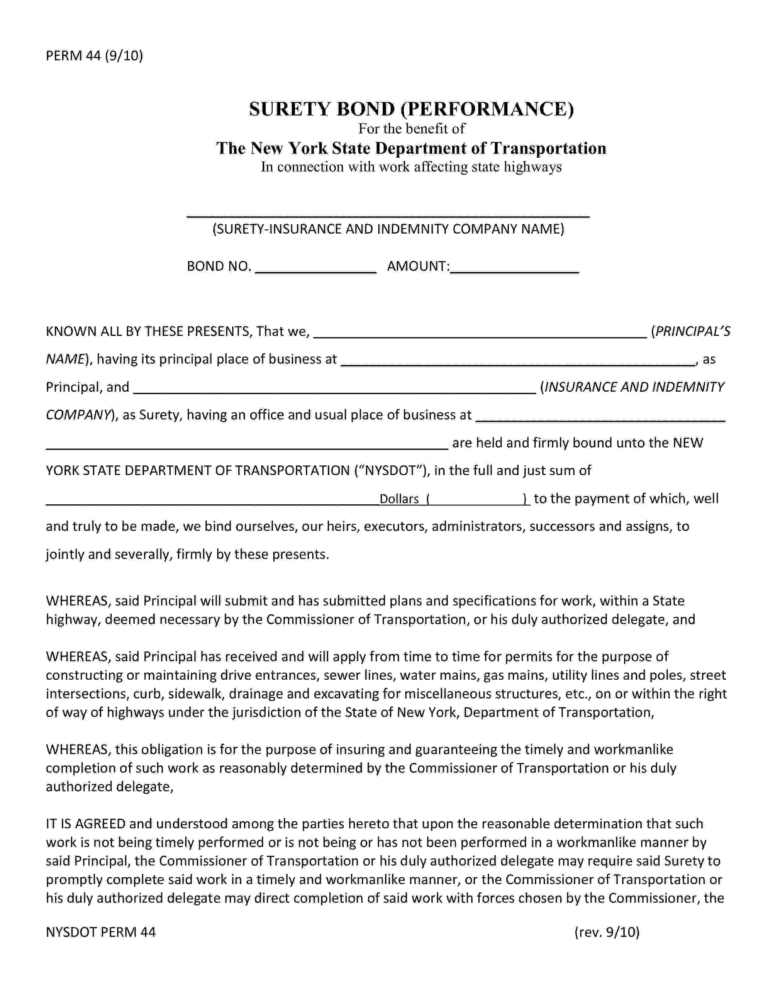 New York State Department of Transportation Highway Permit / Encroachment Performance Bond