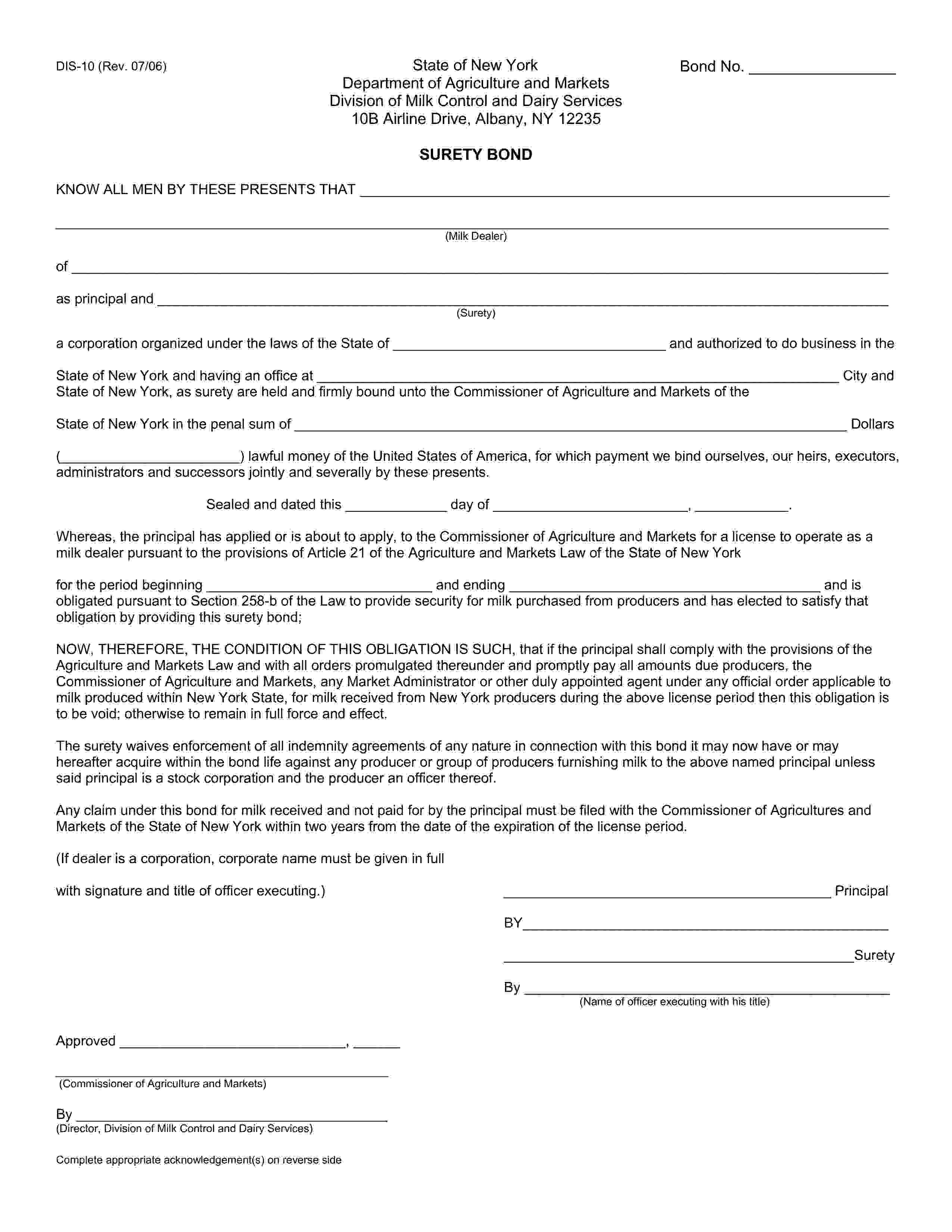 State of New York Milk Dealer Bond