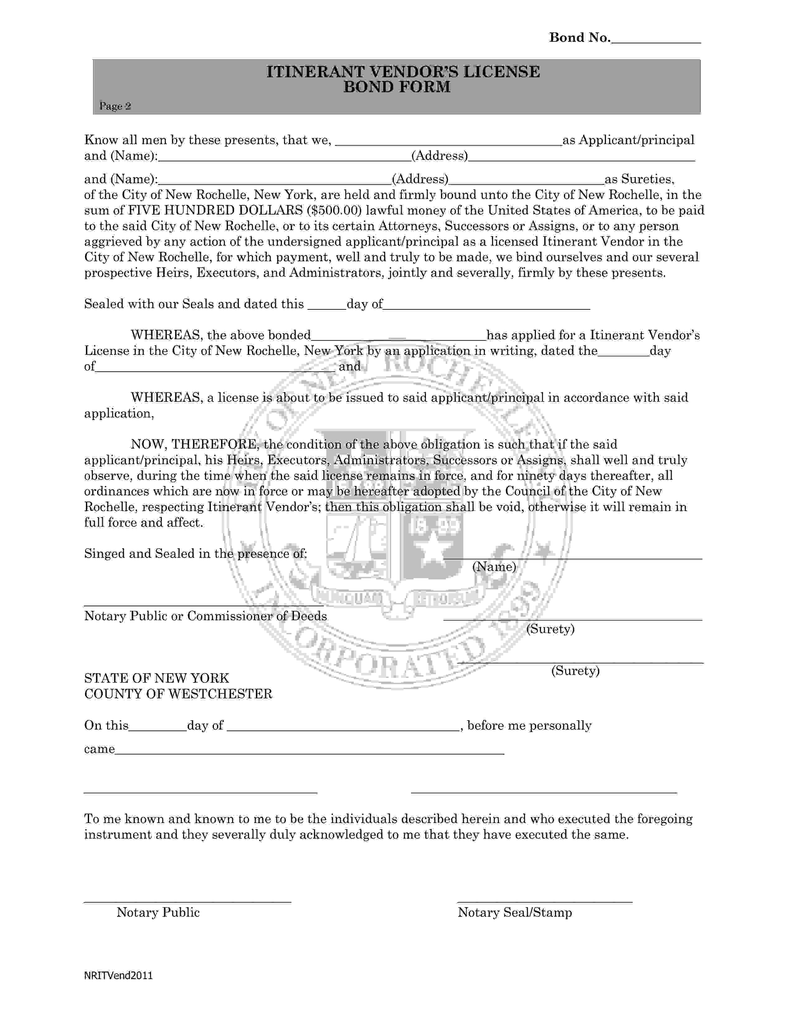 The New York City of New Rochelle Itinerant Vendor License Bond starts at $100 plus shipping costs and fees. Fill out the form to buy your bond instantly!