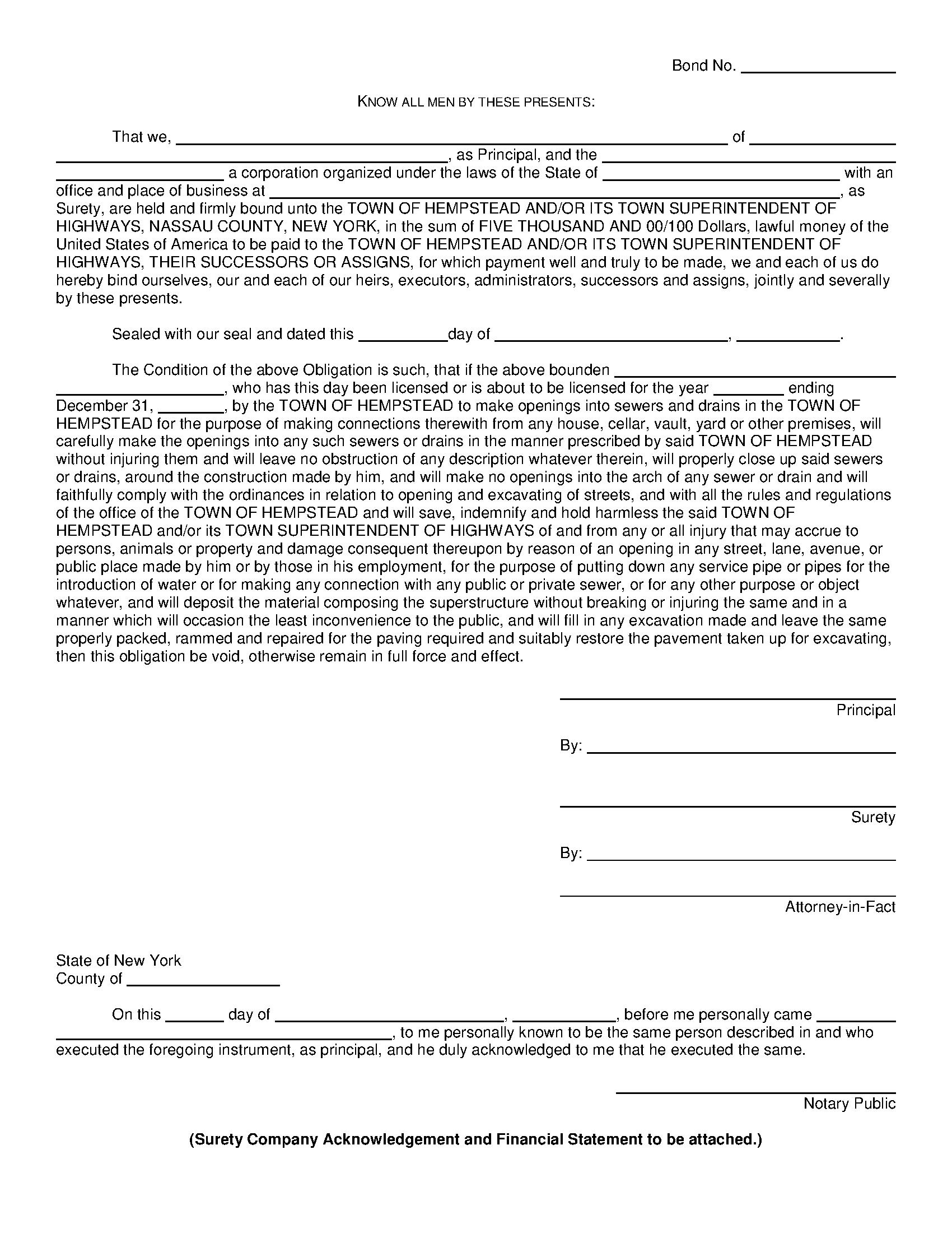 The New York Town of Hempstead Sewer and Drain Openings Bond starts at $100 plus shipping costs and fees. Fill out the form to buy your bond instantly!