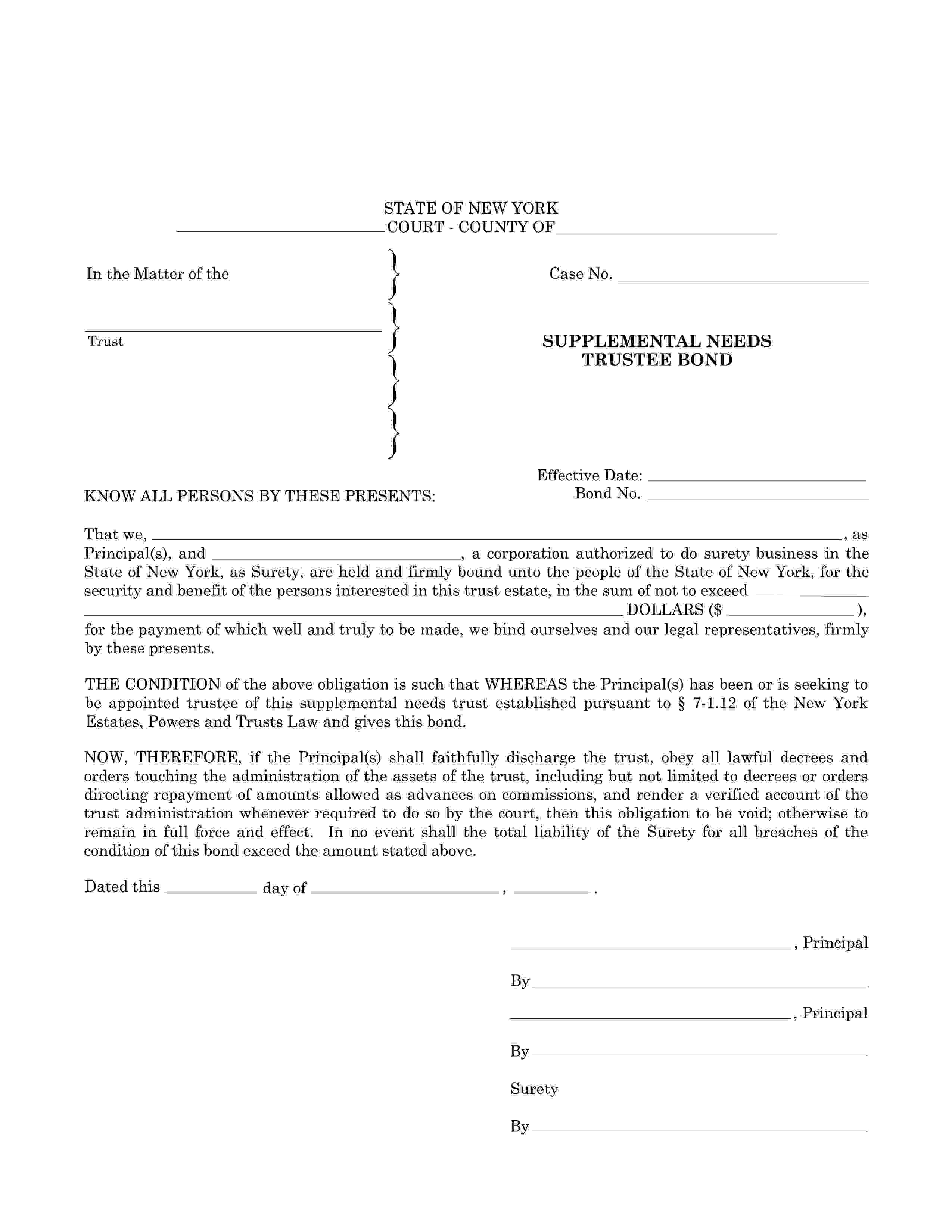 The Supplemental Needs Trustee Bond starts at $100 plus shipping costs and fees. Fill out the form to buy your bond instantly!