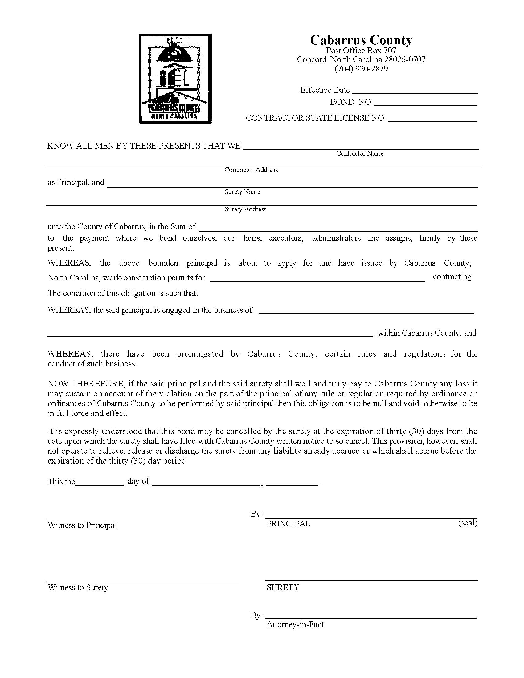 The North Carolina County of Cabarrus Contractor License & Permit Bond starts at $100 plus shipping costs and fees. Fill out the form to buy your bond instantly!
