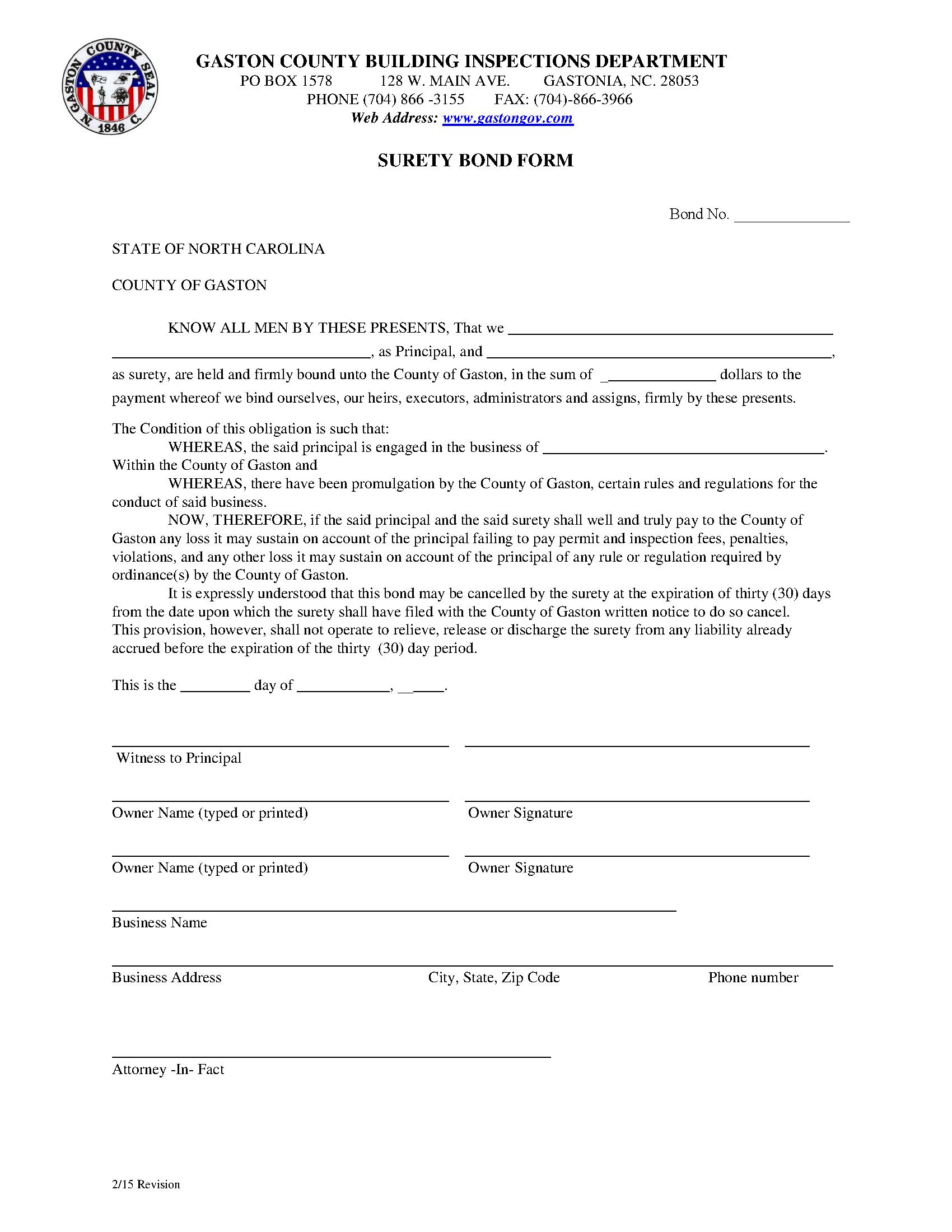The North Carolina Gaston County License/Permit Bond starts at $100 plus shipping costs and fees. Fill out the form to buy your bond instantly!