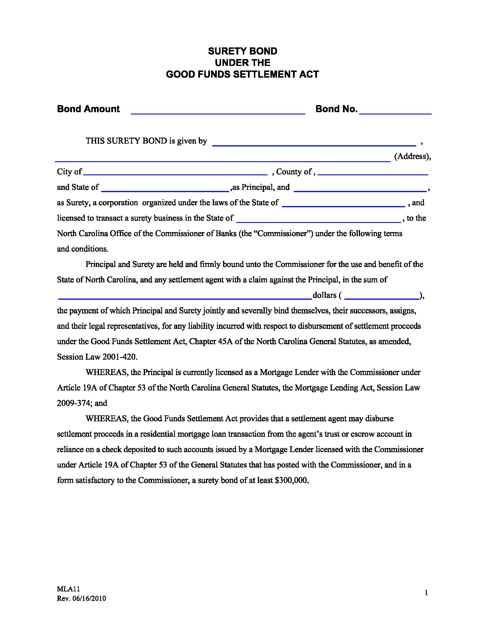 The North Carolina Good Funds Settlement Agent Bond starts at $3000 plus shipping costs and fees. Fill out the form to buy your bond instantly!