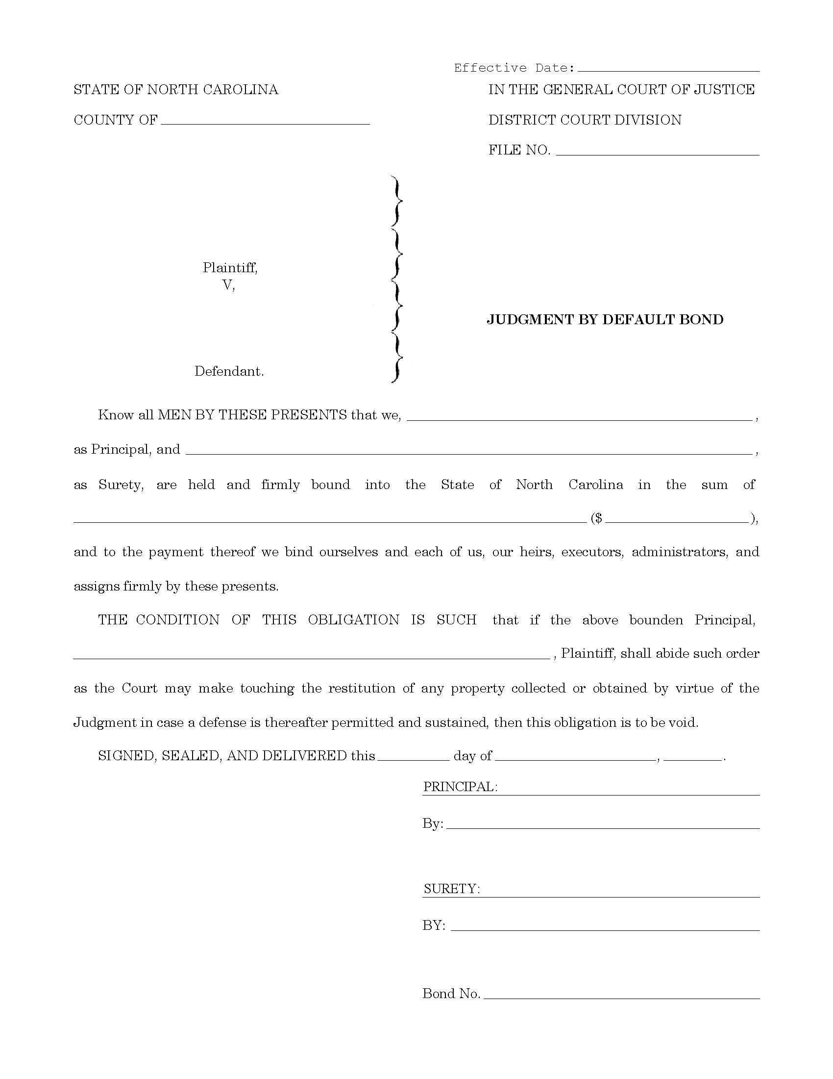 The North Carolina Judgment By Default Bond starts at $100 plus shipping costs and fees. Fill out the form to buy your bond instantly!