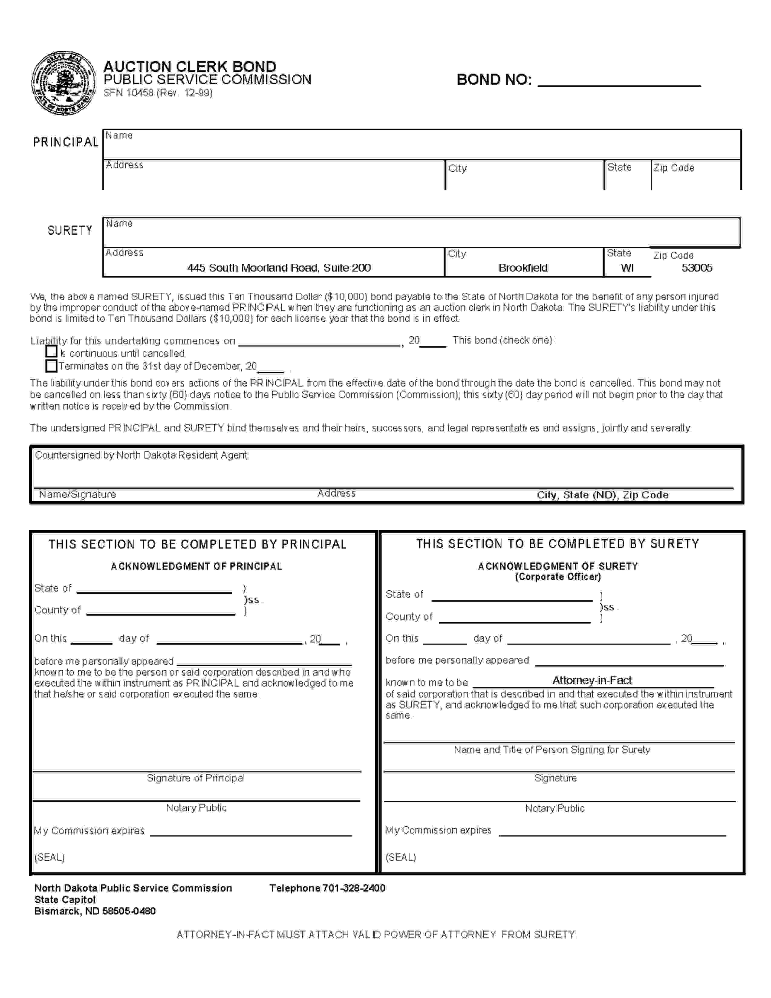 The North Dakota Auction Clerk Bond starts at $100 plus shipping costs and fees. Fill out the form to buy your bond instantly!