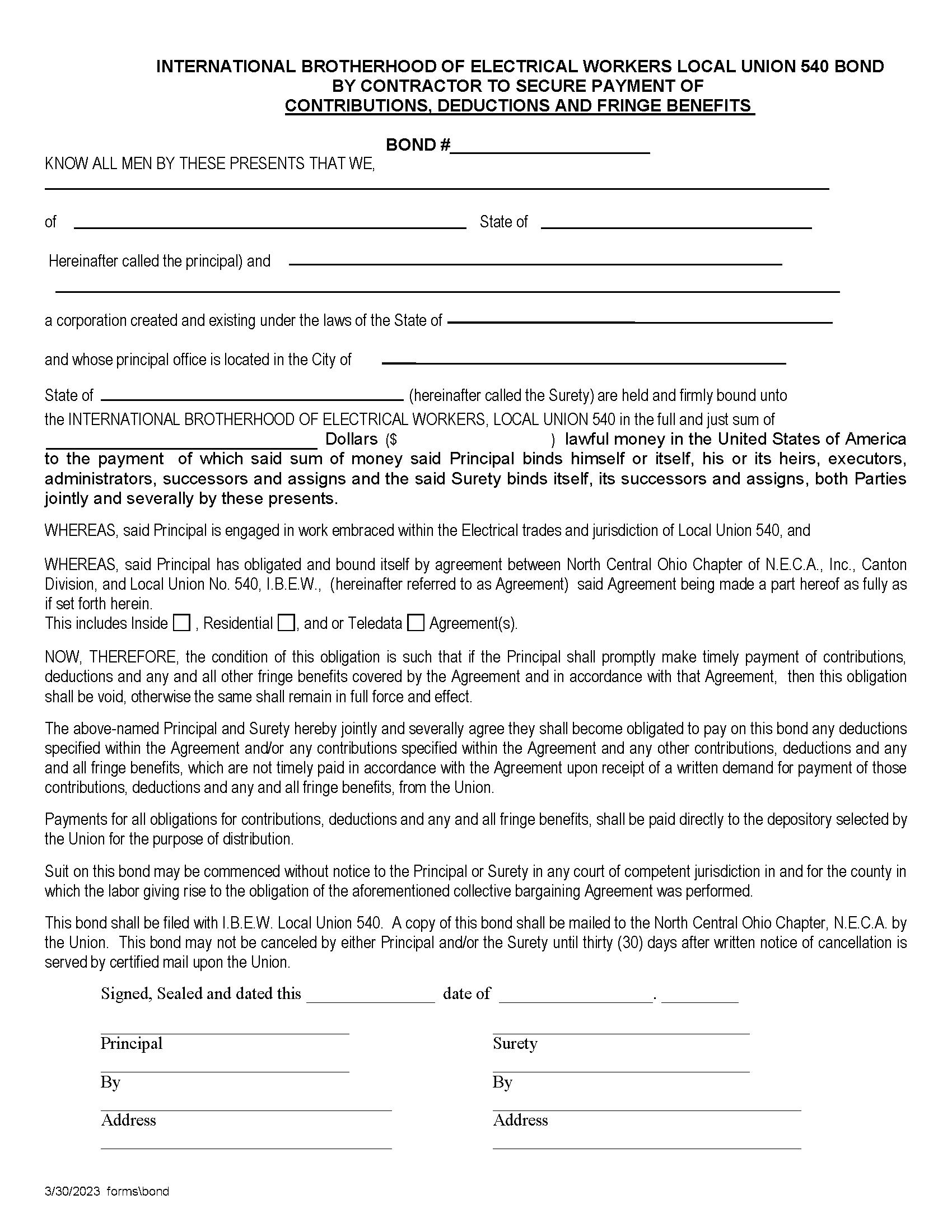 The International Brotherhood of Electrical Workers, Local Union 540 Fringe Benefits Only Bond starts at $100 plus shipping costs and fees. Fill out the form to buy your bond instantly!