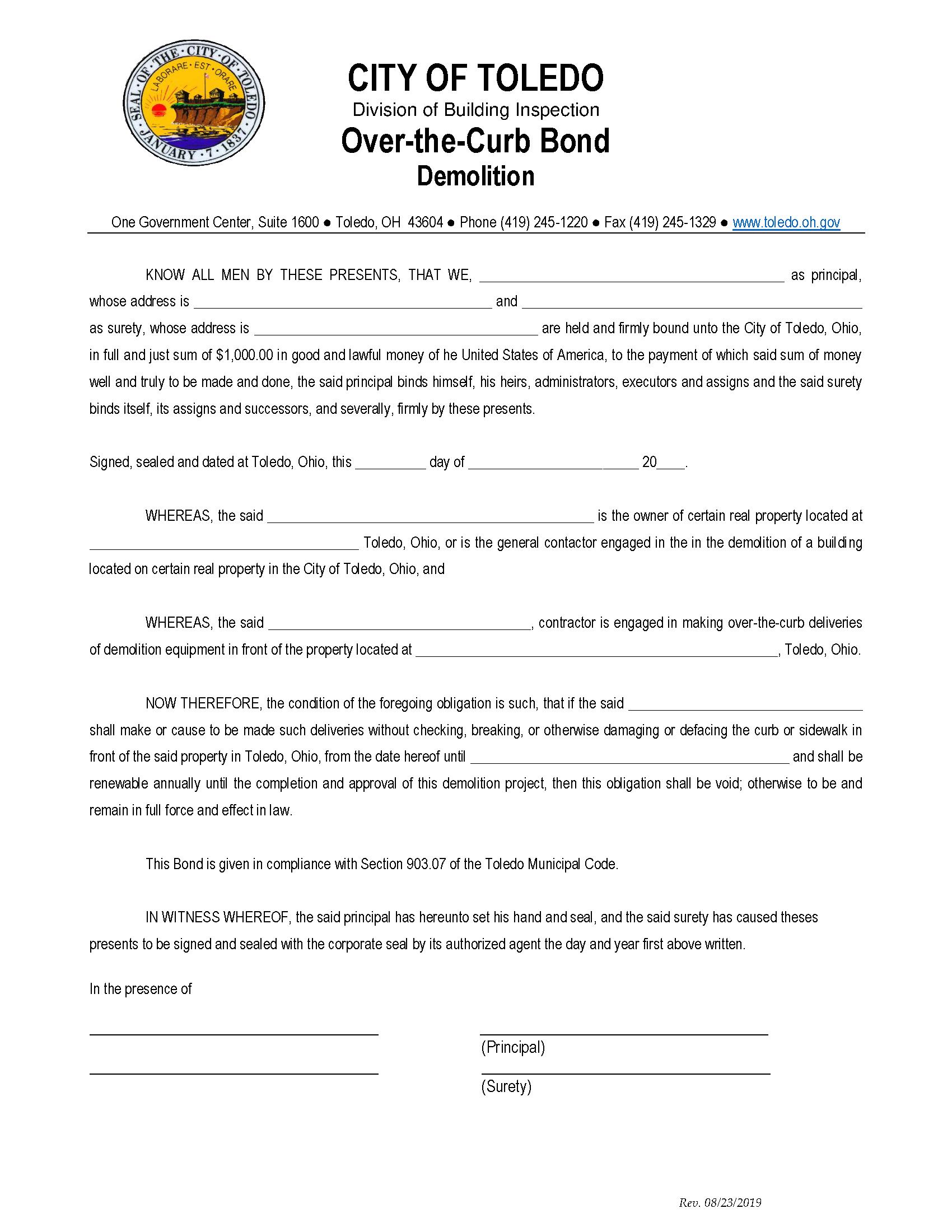 The Ohio City of Toledo Over The Curb - Demolition Bond starts at $100 plus shipping costs and fees. Fill out the form to buy your bond instantly!