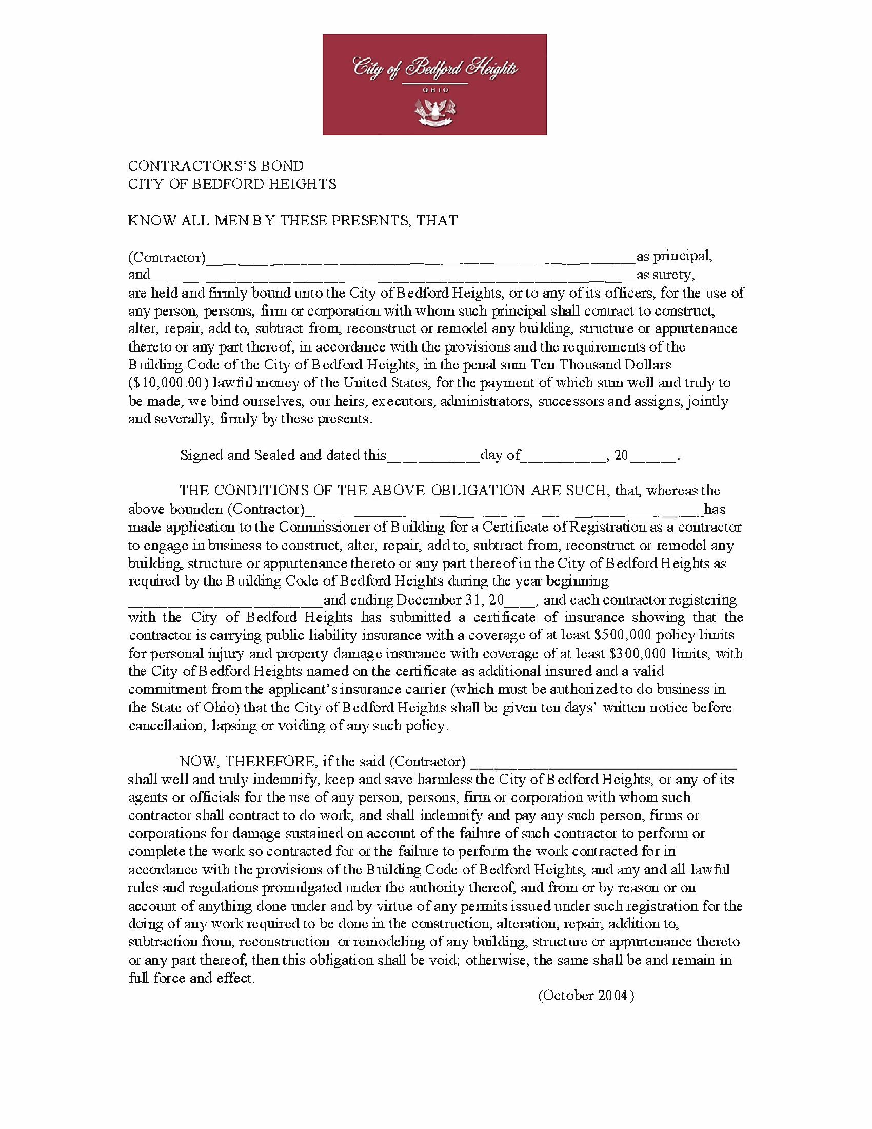 City of Bedford Heights Contractor's License Bond