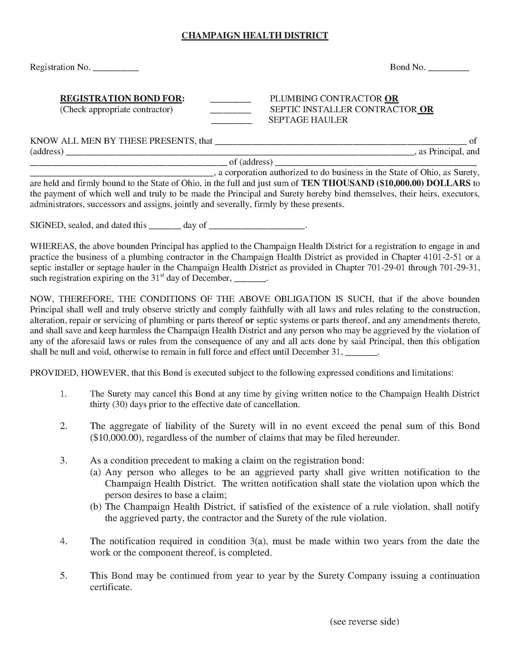 Champaign Health District Plumbing Contractor Bond