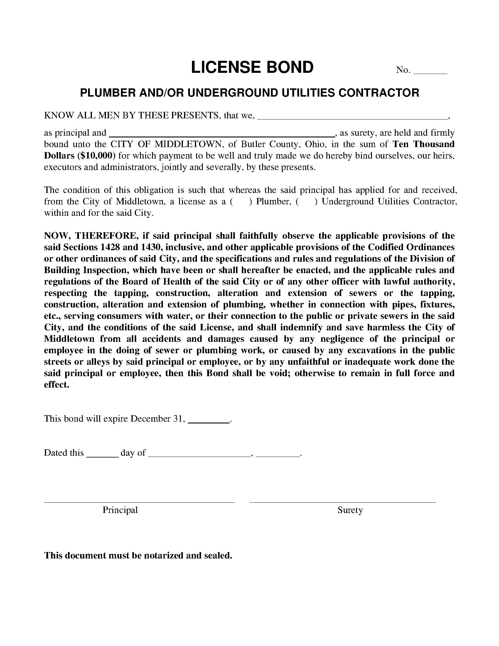 City of Middletown, of Butler County Plumber and/or Underground Utilities Contractor Bond