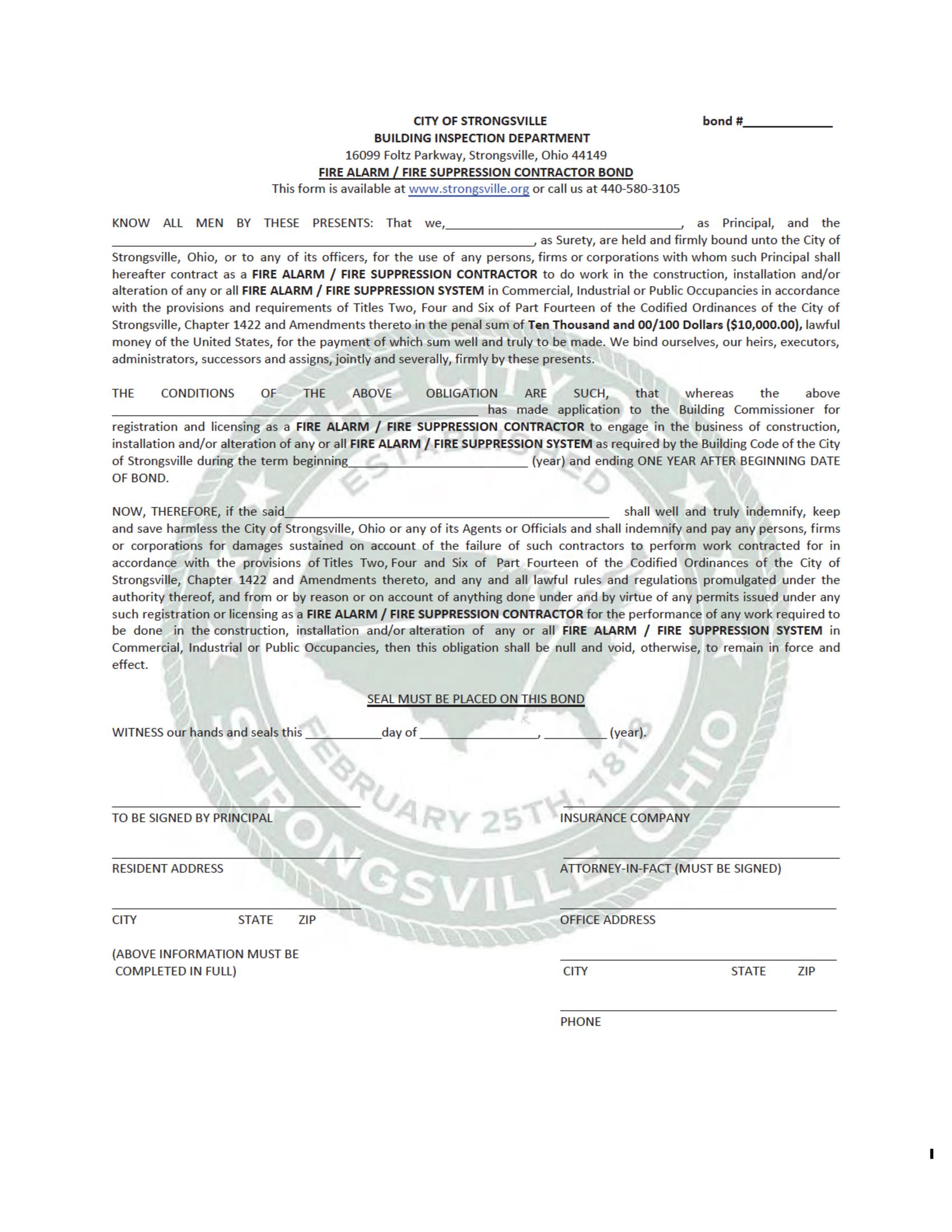 City of Strongsville Fire Alarm/Fire Suppression Contractor Bond