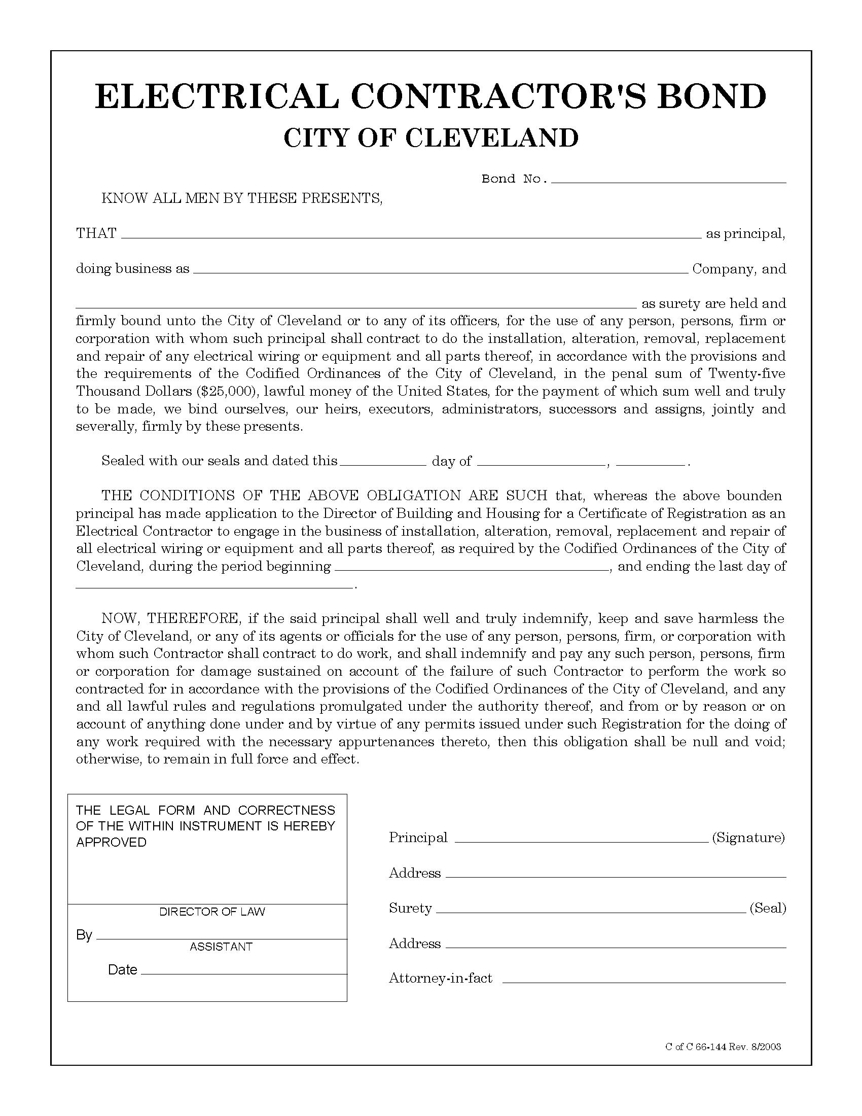 The Ohio City of Cleveland Electrical Contractor Bond starts at $125 plus shipping costs and fees. Fill out the form to buy your bond instantly!