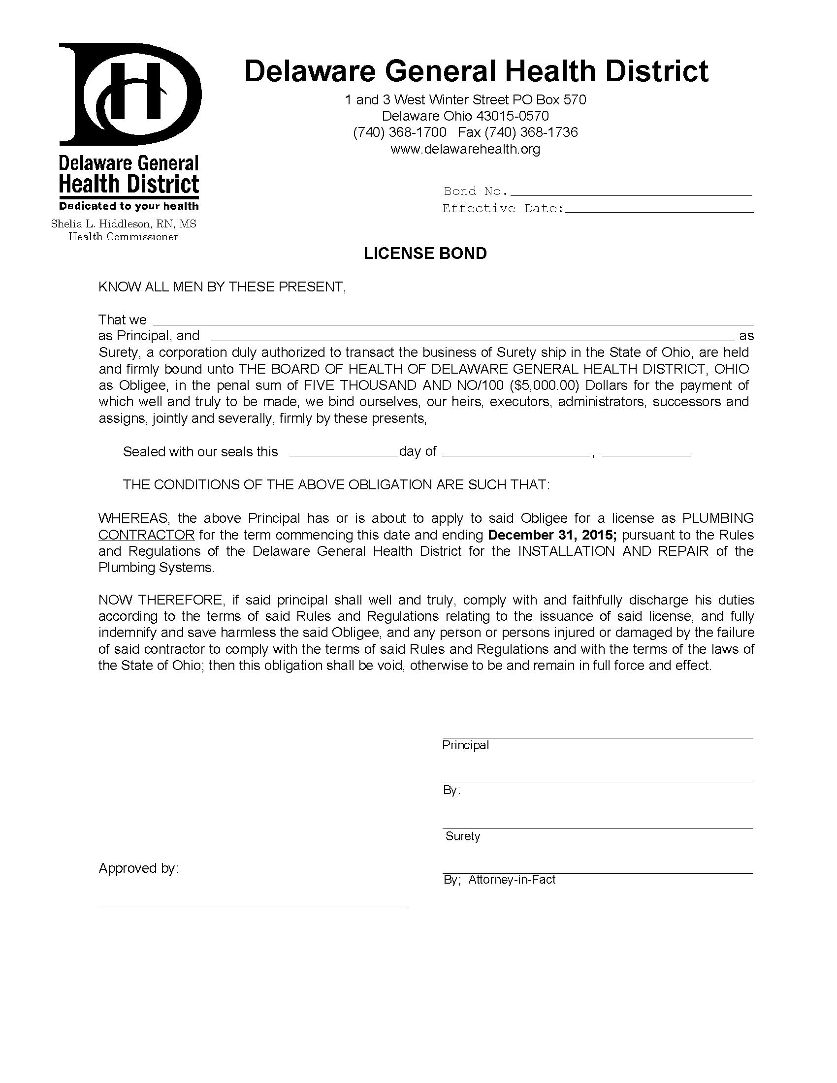 The Board of Health of Delaware Public Health District, Ohio Plumbing Contractor Bond