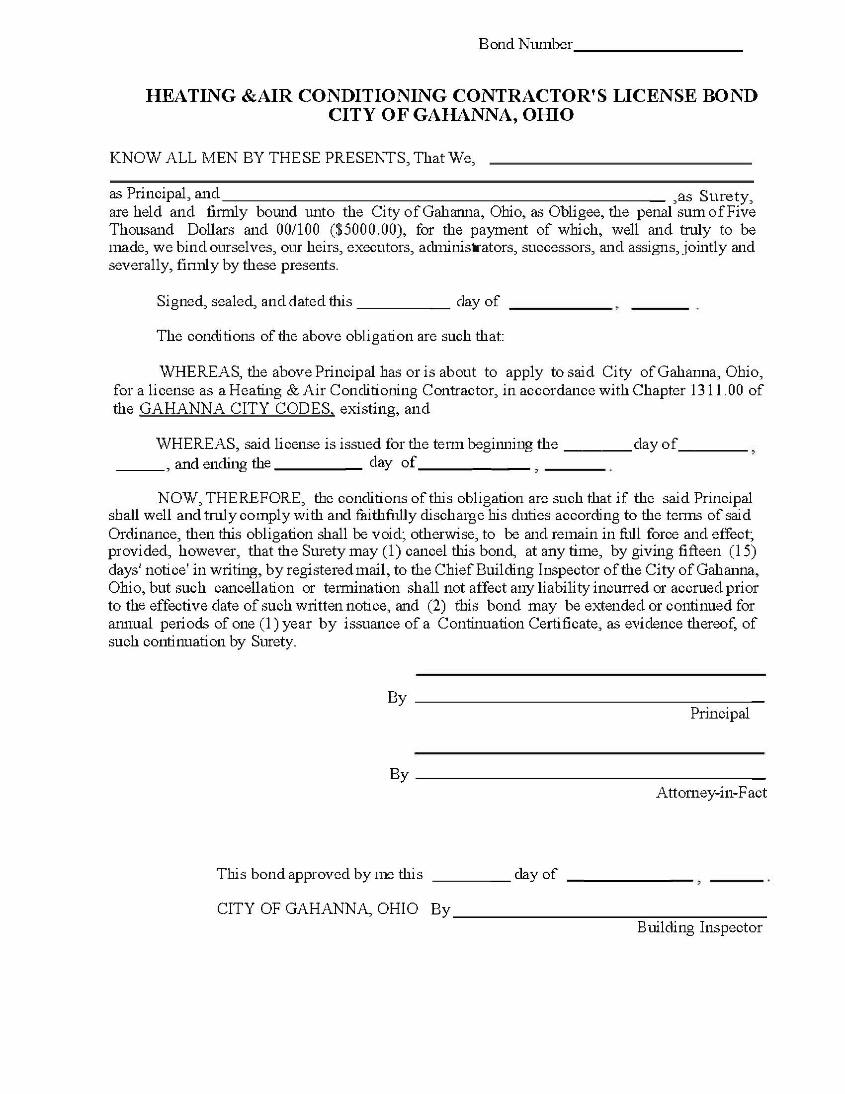 City of Gahanna, Ohio Contractor License Bond