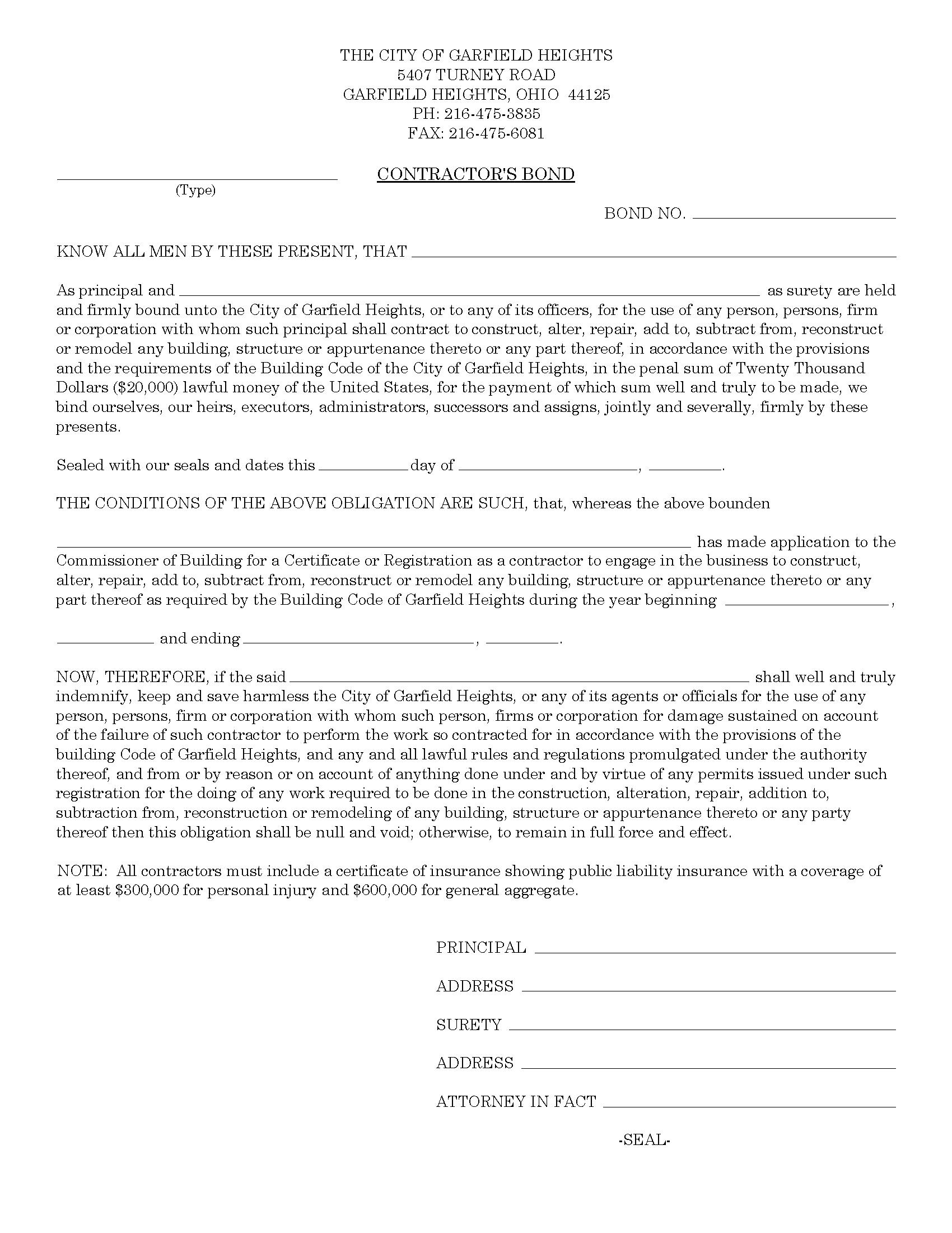 The Ohio City of Garfield Heights Contractor's License Bond starts at $200 plus shipping costs and fees. Fill out the form to buy your bond instantly!