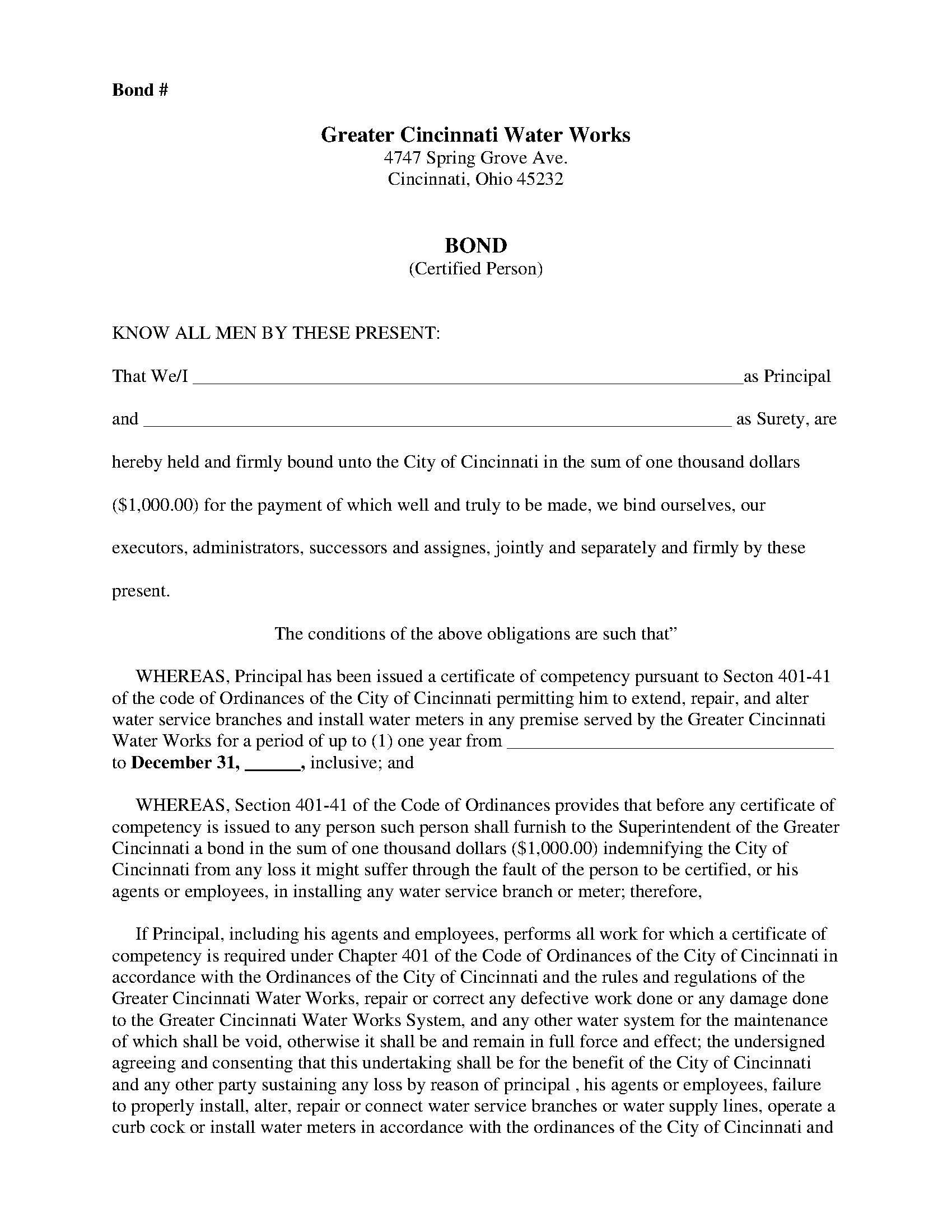 Greater Cincinnati Water Works Certified Person (Water Works) Bond