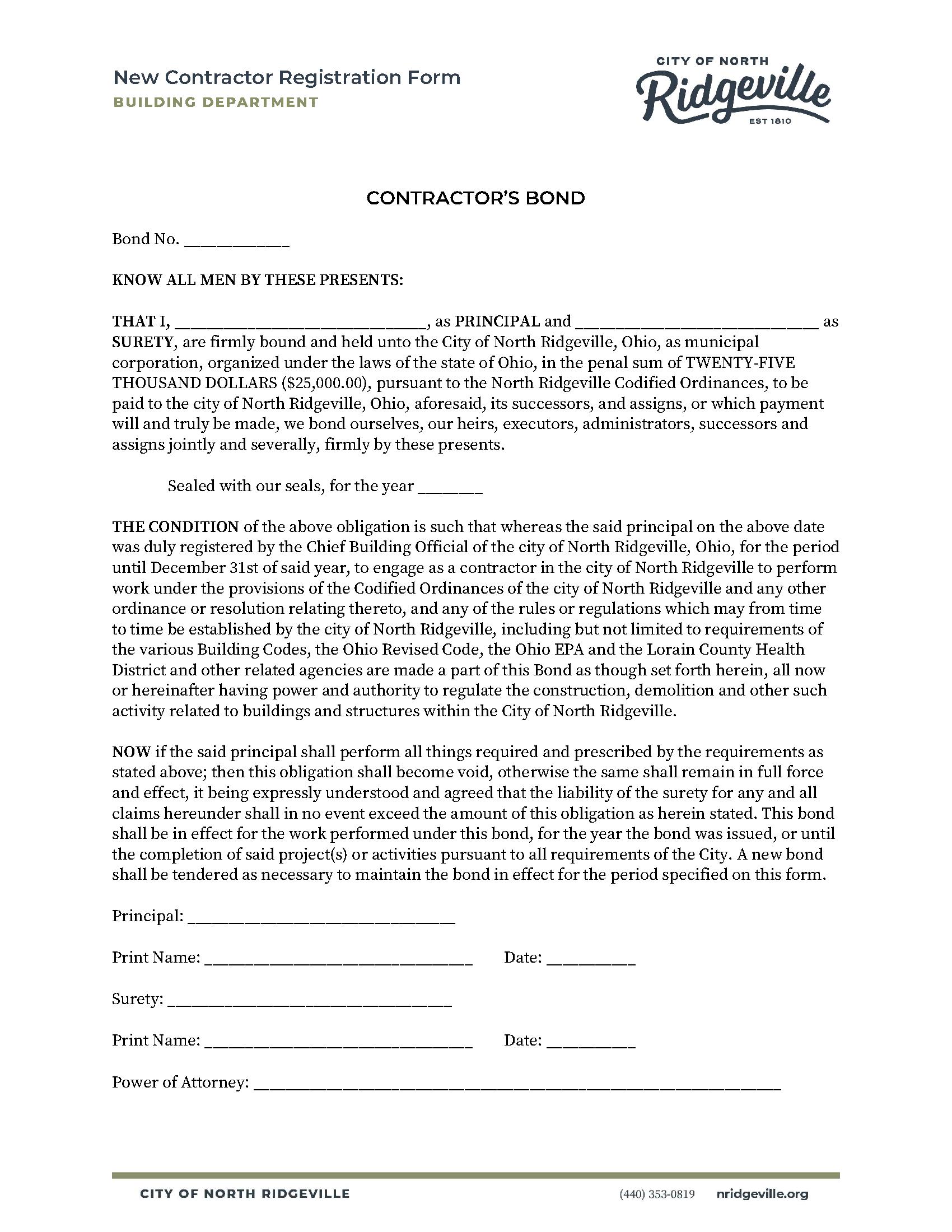 The City of North Ridgeville Contractor’s License Bond is a surety bond required by the City of North Ridgeville Building Department as part of the contractor’s license application. This bond guarantees that the licensed contractors will meet their license requirements and adhere to North Ridgeville coding ordinances.