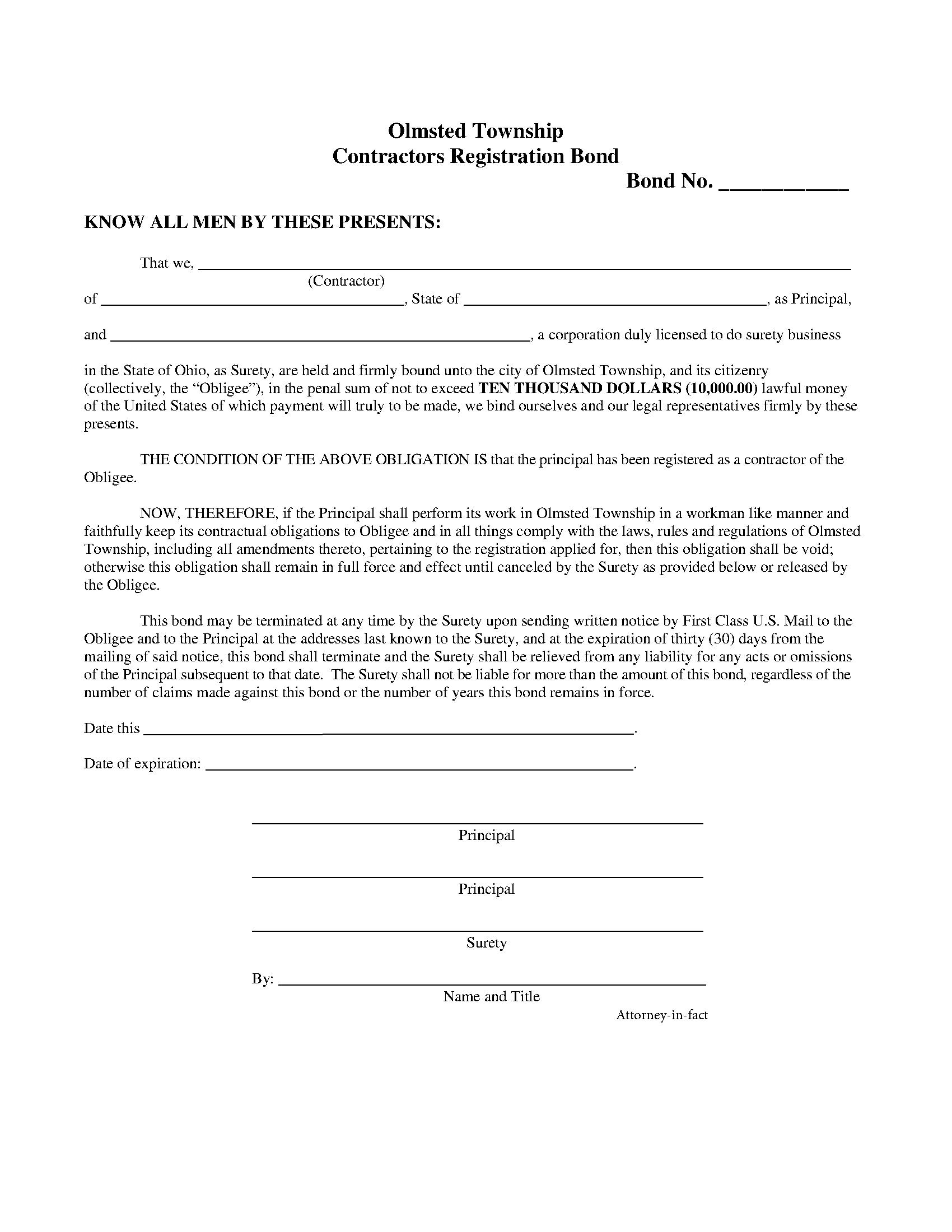 The Ohio Olmsted Township Contractors Registration Bond starts at $100 plus shipping costs and fees. Fill out the form to buy your bond instantly!