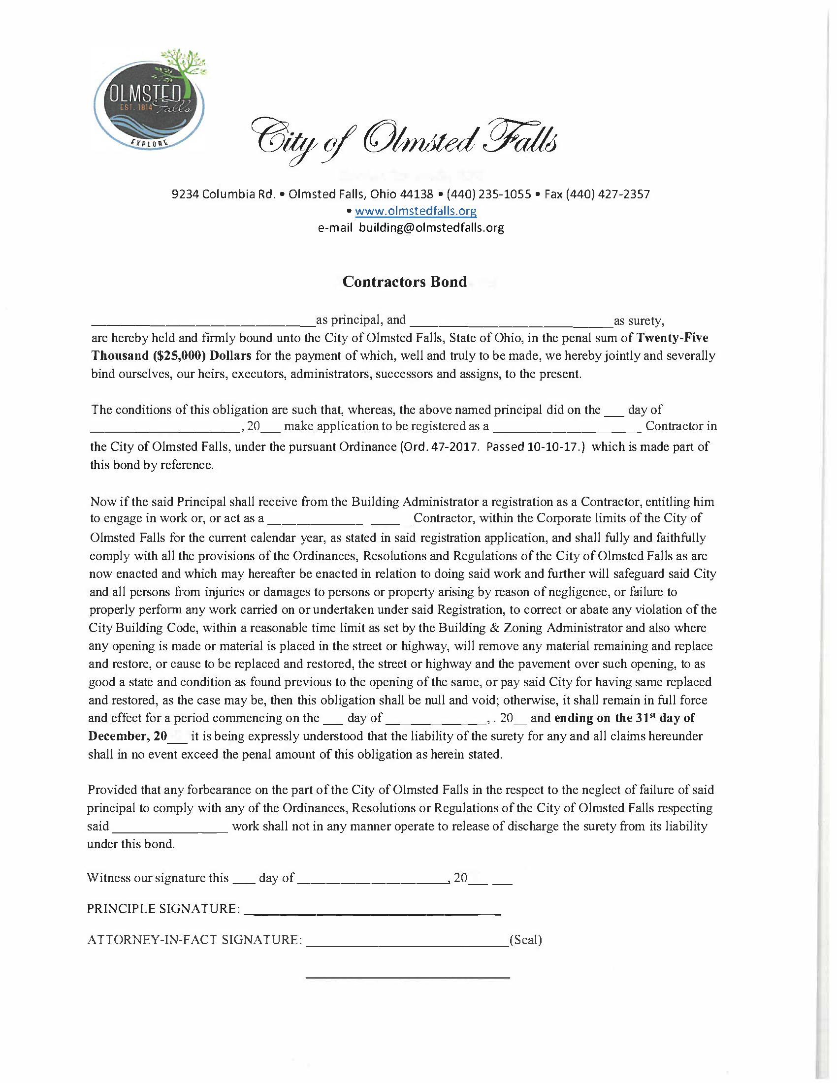 The Ohio City of Olmsted Falls License/Permit Bond starts at $125 plus shipping costs and fees. Fill out the form to buy your bond instantly!