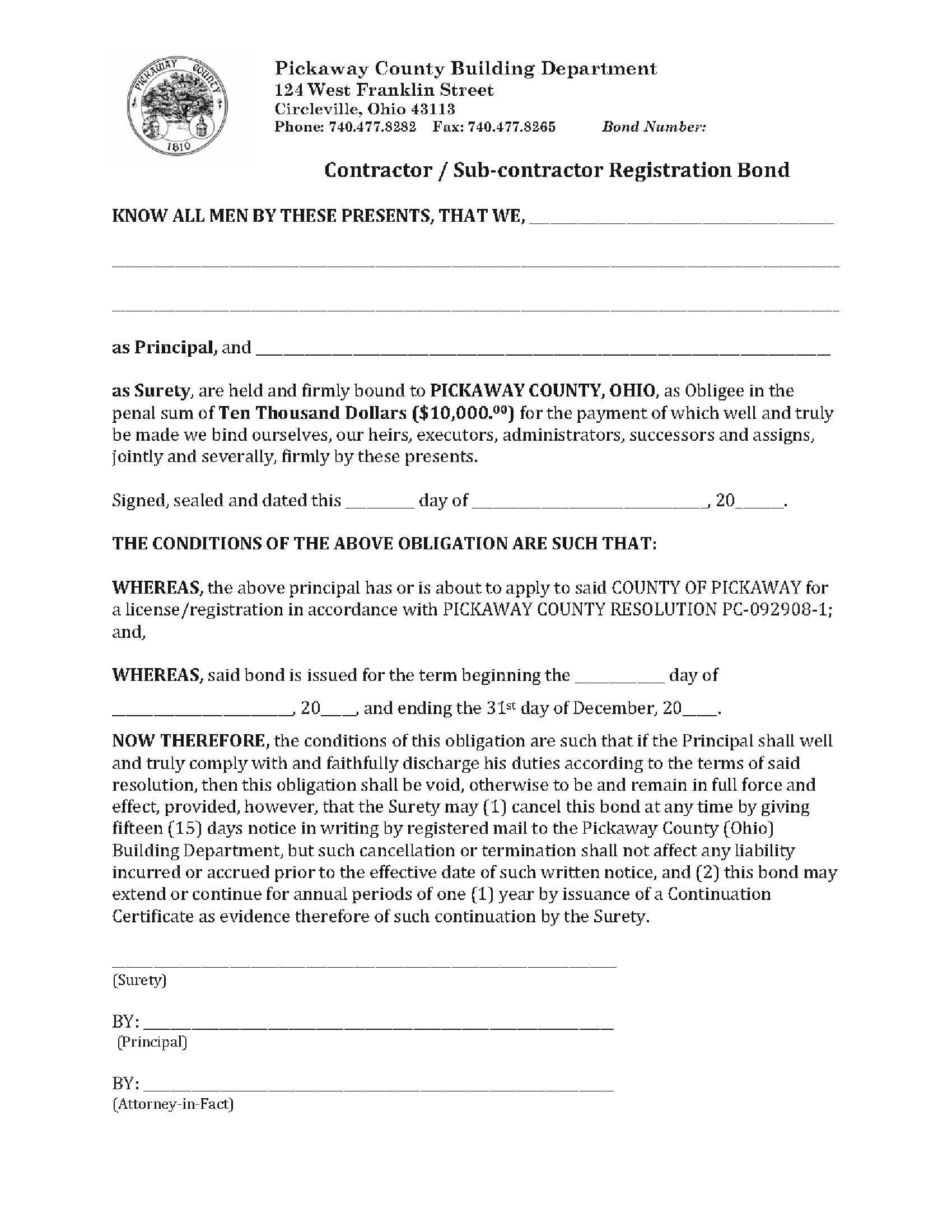 Pickaway County, Ohio Contractor / Sub-contractor Registration Bond