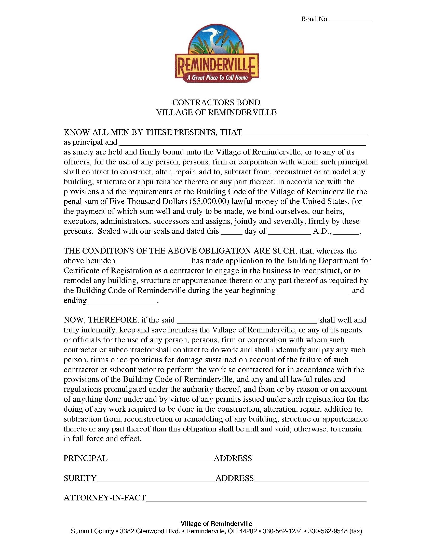 Village of Reminderville Contractor's License Bond