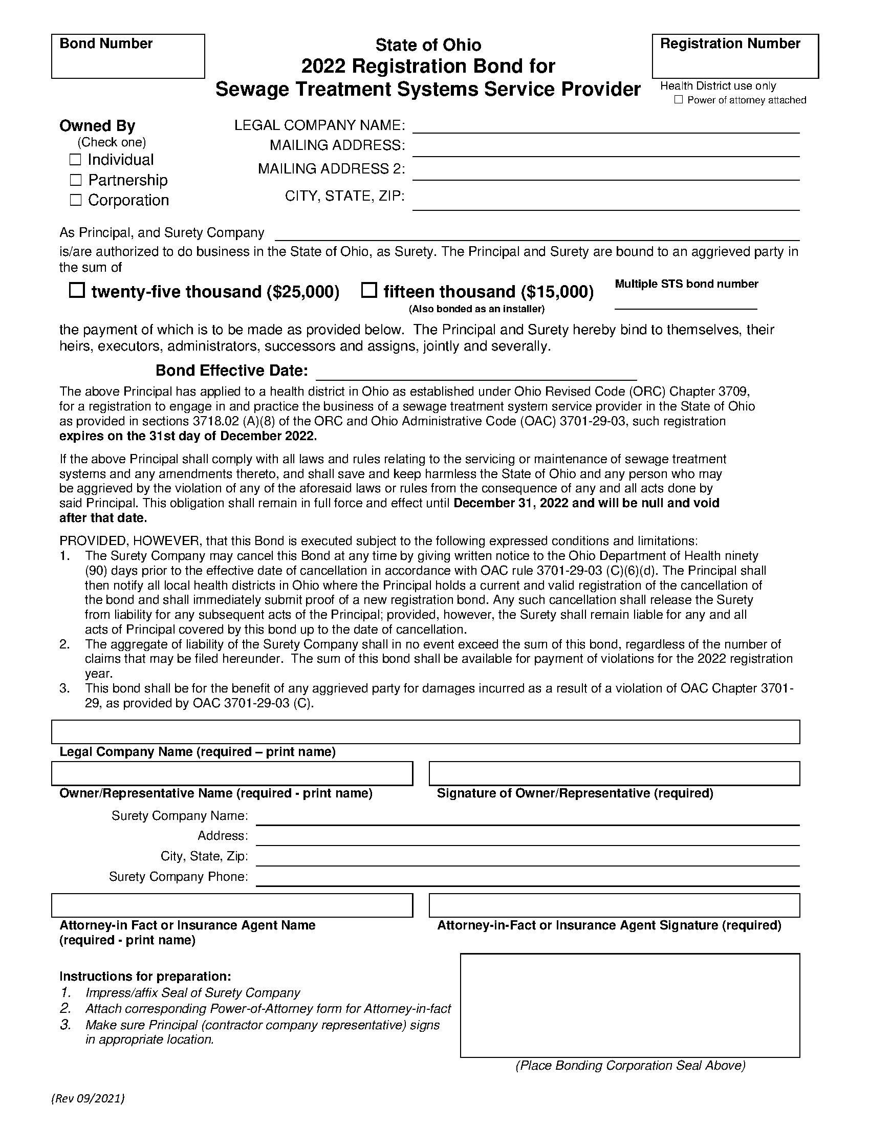 The Ohio Sewage Treatment Systems Service Provider Bond starts at $150 plus shipping costs and fees. Fill out the form to buy your bond instantly!