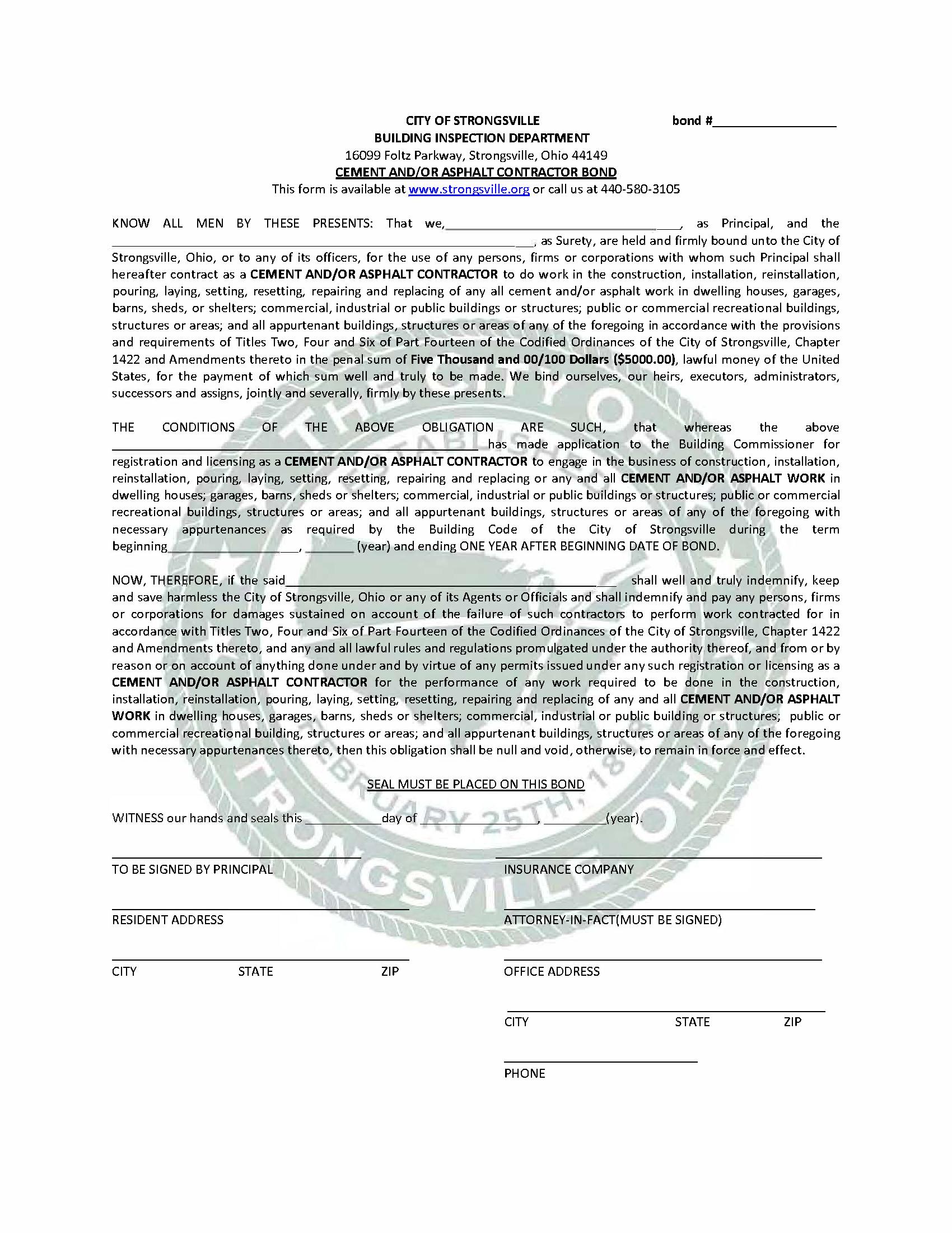 City of Strongsville Cement and/or Asphalt Contractor Bond