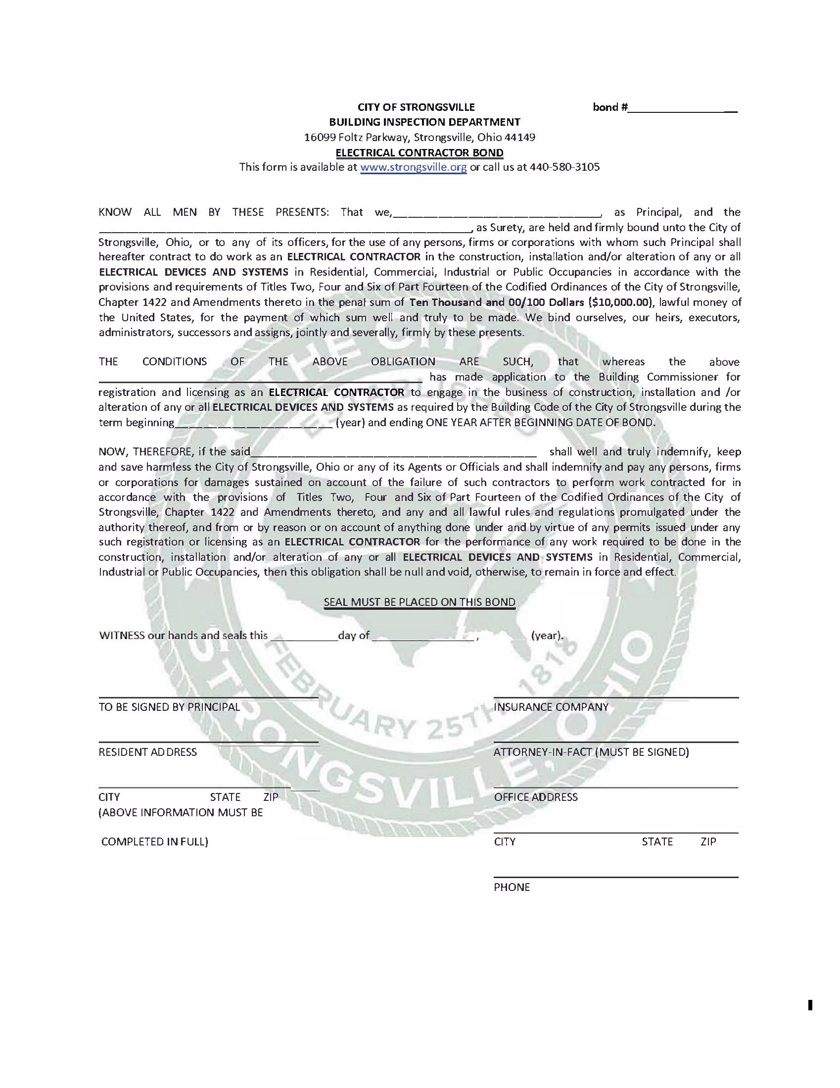 The Ohio City of Strongsville Electrical Contractor Bond Bond starts at $100 plus shipping costs and fees. Fill out the form to buy your bond instantly!