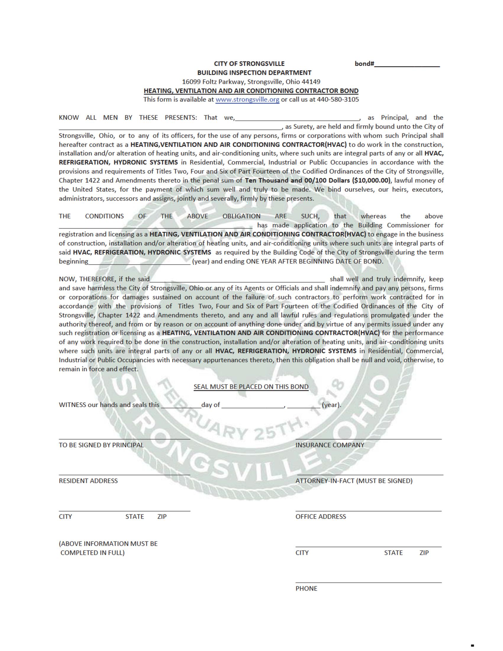 City of Strongsville Heating, Ventilation and Air Conditioning Contractor Bond