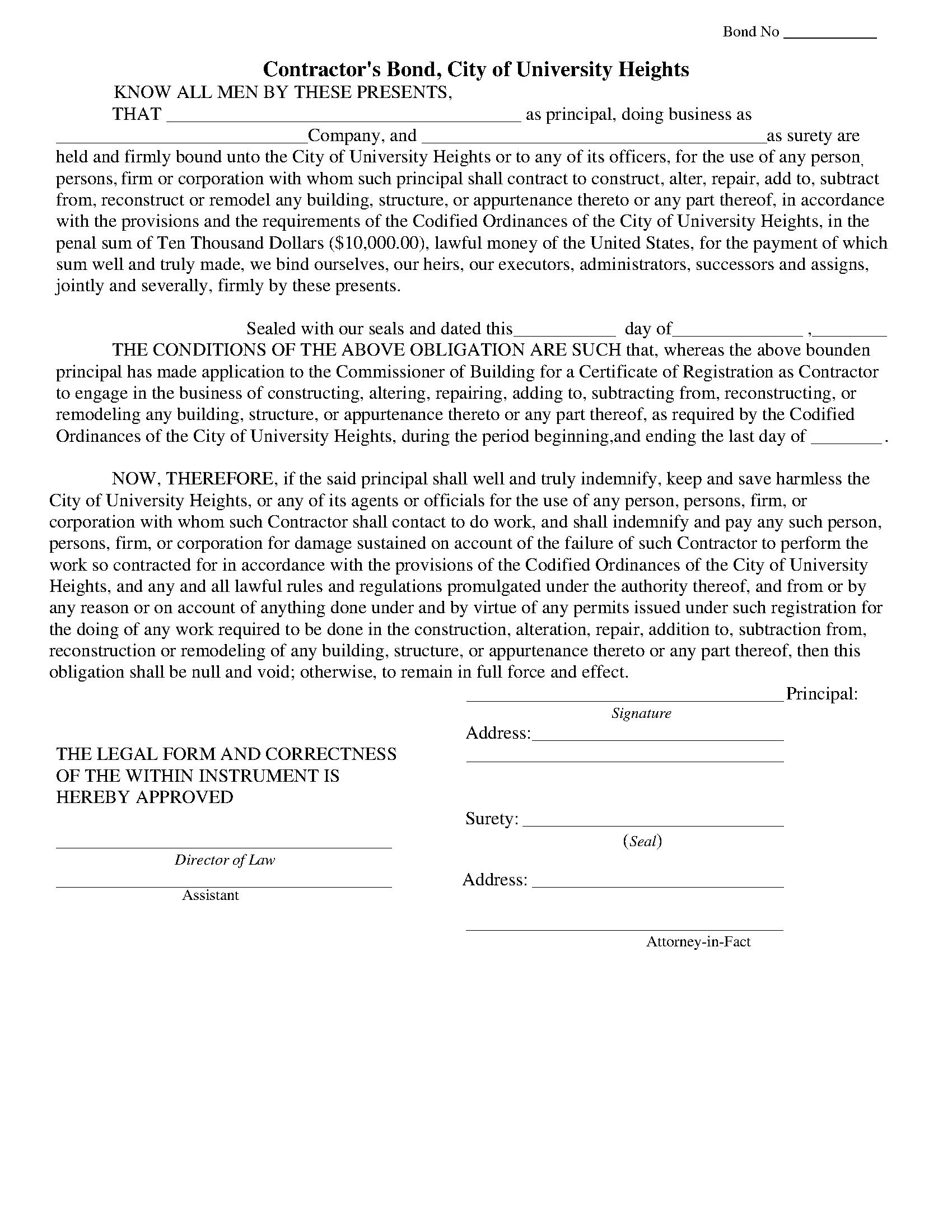City of University Heights Contractor's License Bond