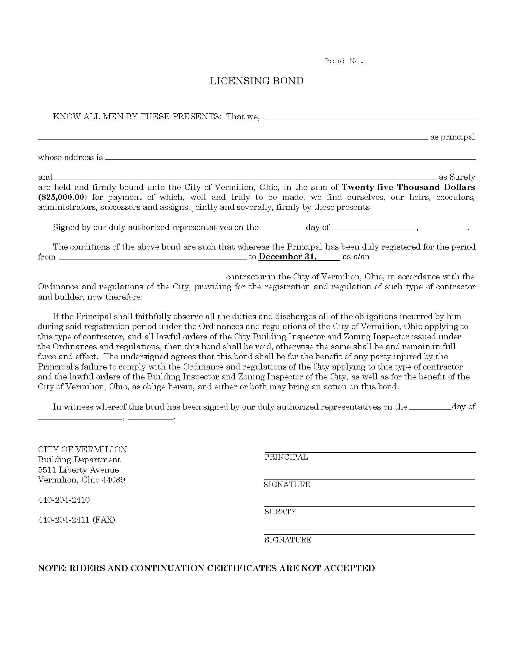 The Ohio City of Vermilion, Ohio Licensing Bond Bond starts at $286 plus shipping costs and fees. Fill out the form to buy your bond instantly!