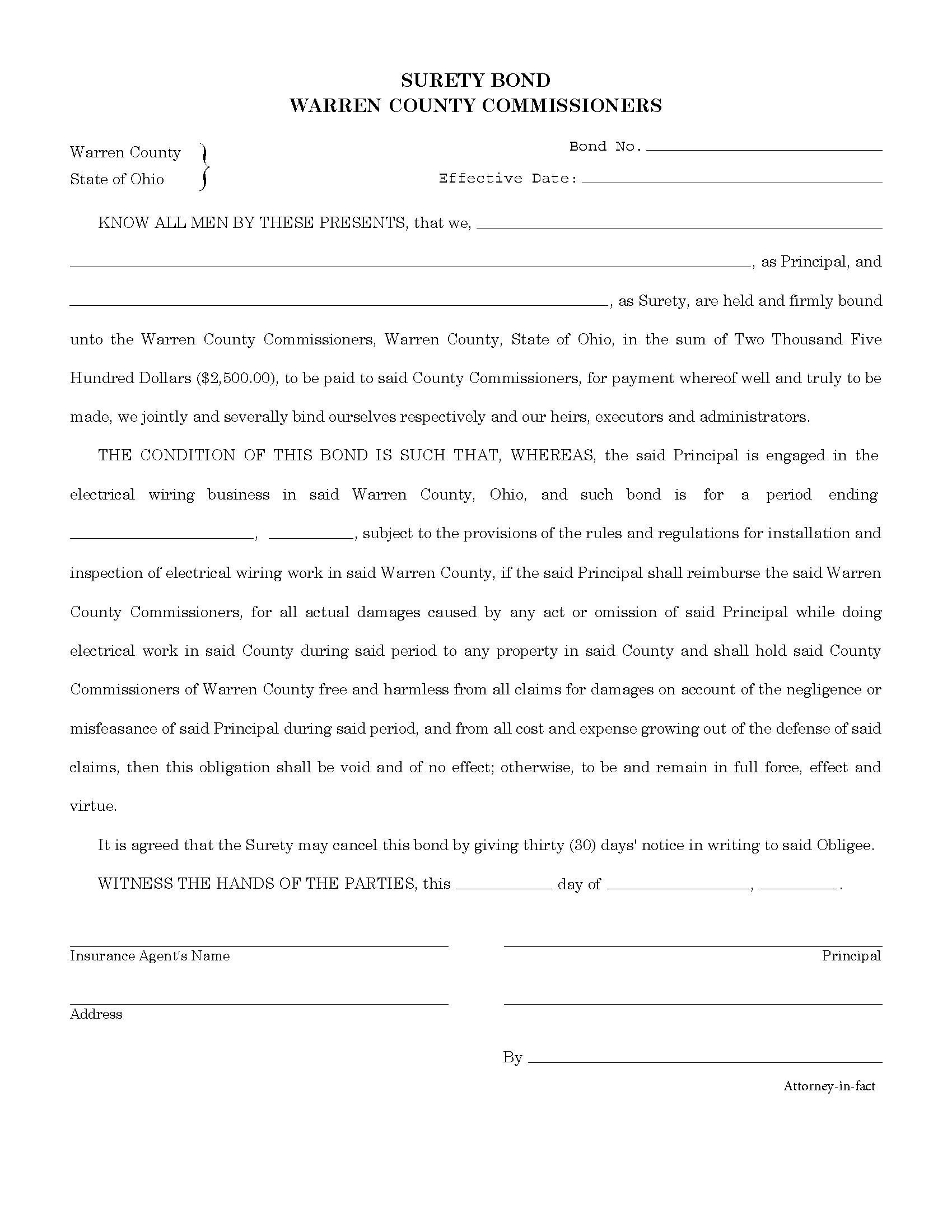The Ohio Warren County Commissioners Electrical Contractor Bond starts at $100 plus shipping costs and fees. Fill out the form to buy your bond instantly!