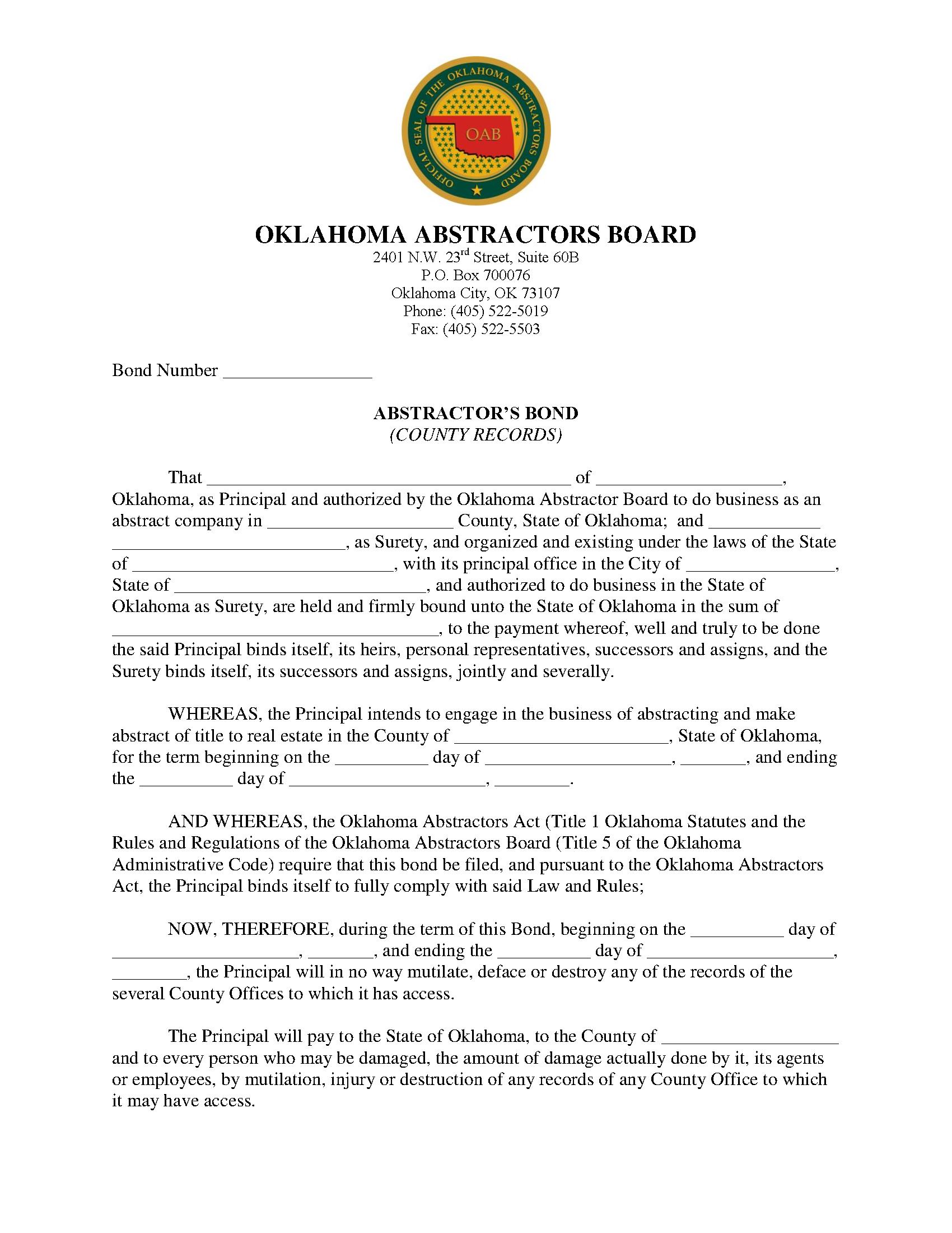 The Oklahoma Abstractor (Title Agent) Bond starts at $100 plus shipping costs and fees. Fill out the form to buy your bond instantly!